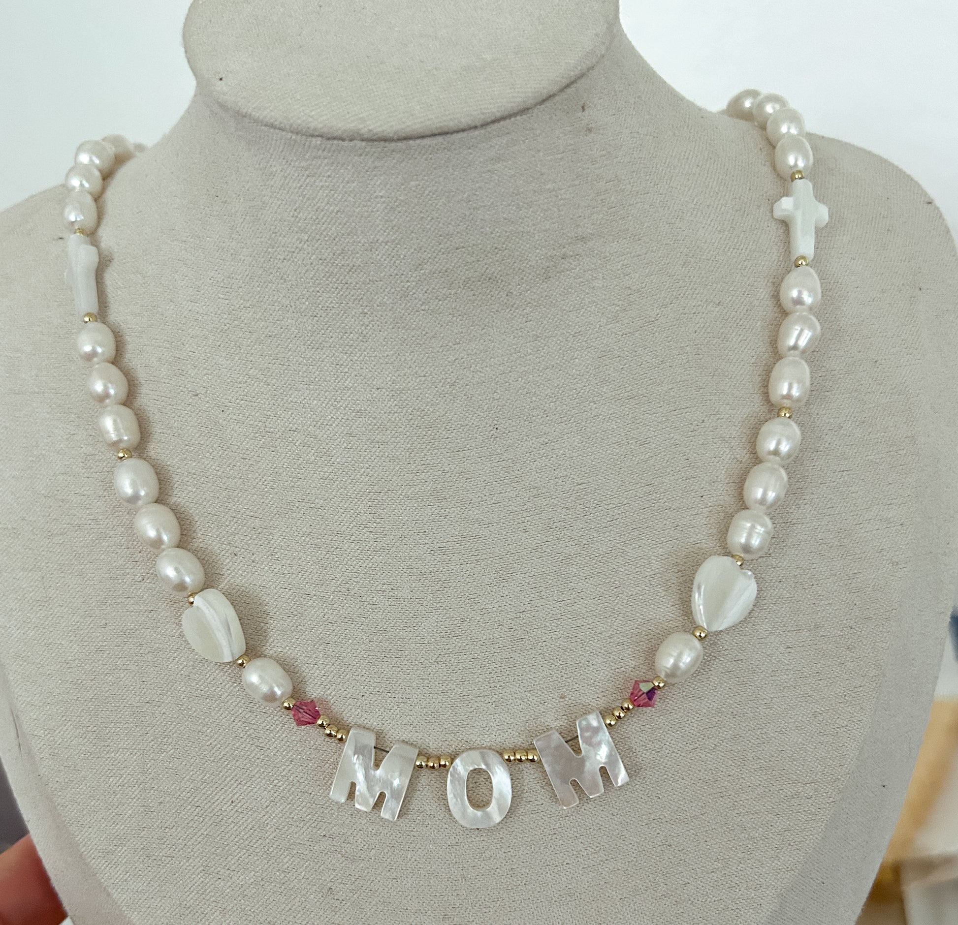 Made with freshwater pearls and mother of pearls letters. Stainless steel endings, 17”.