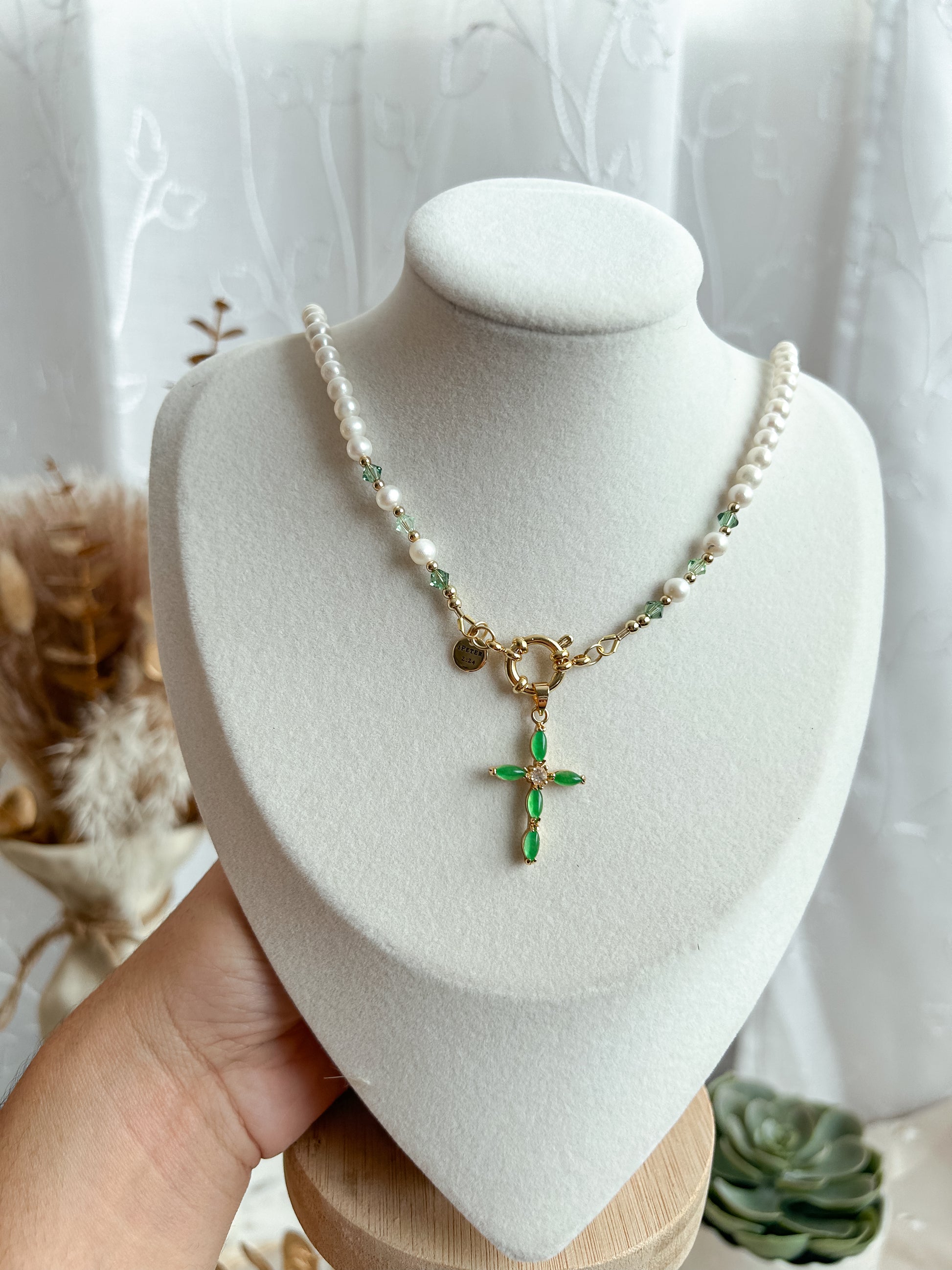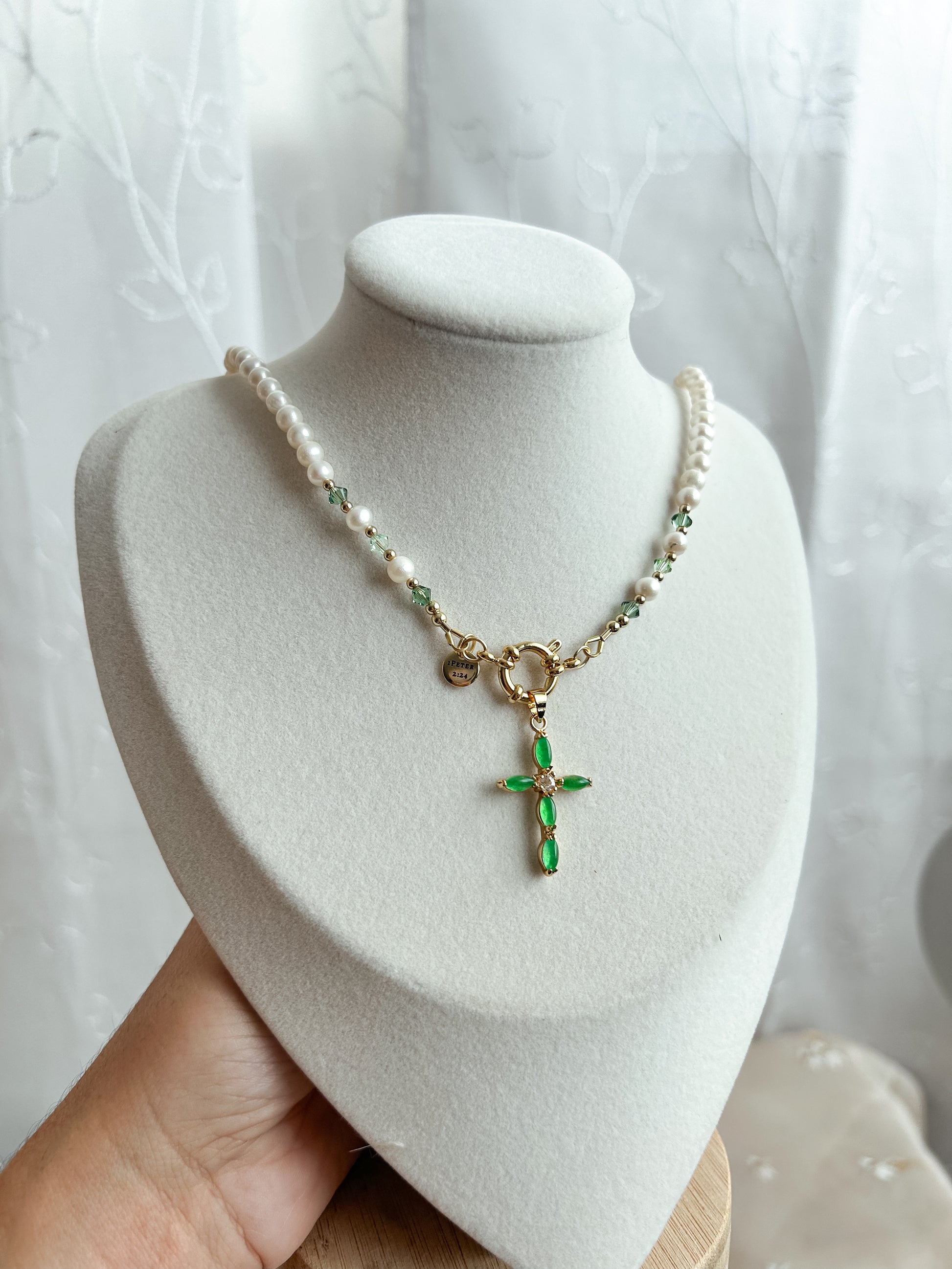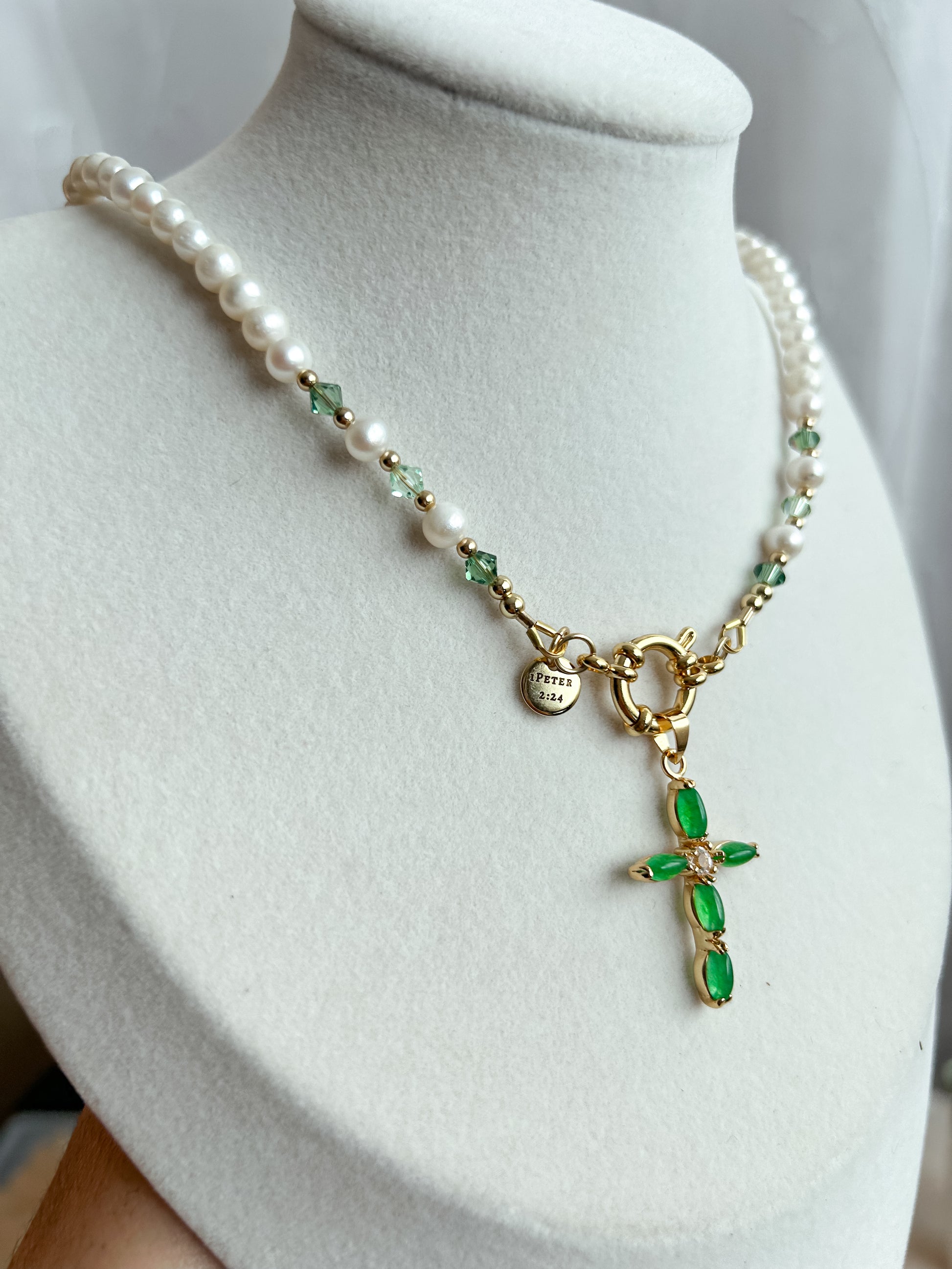 Freshwater pearls, gold-filled cubic zirconia cross charm and green Swarovski.