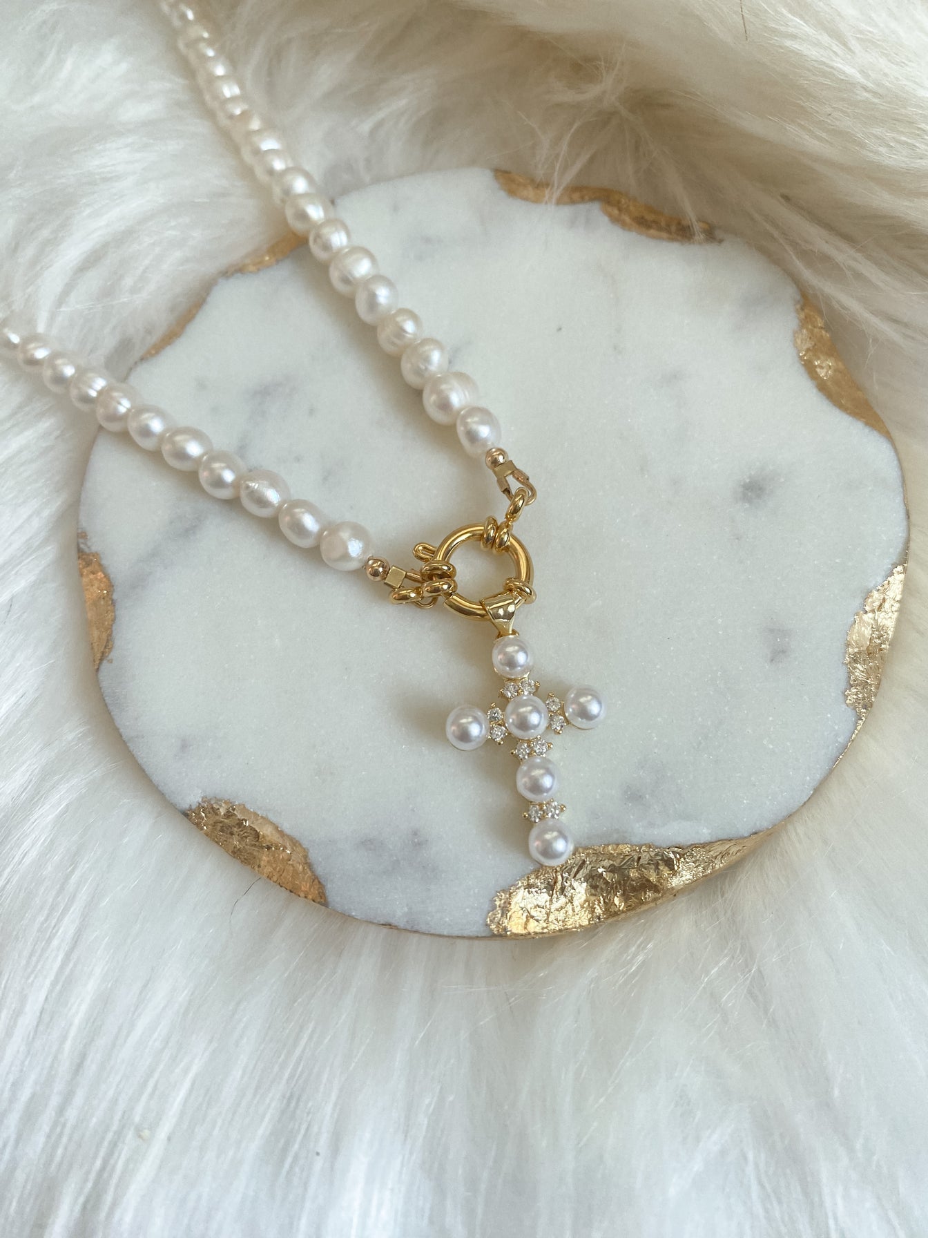 Freshwater pearls, gold-filled cubic zirconia cross charm.