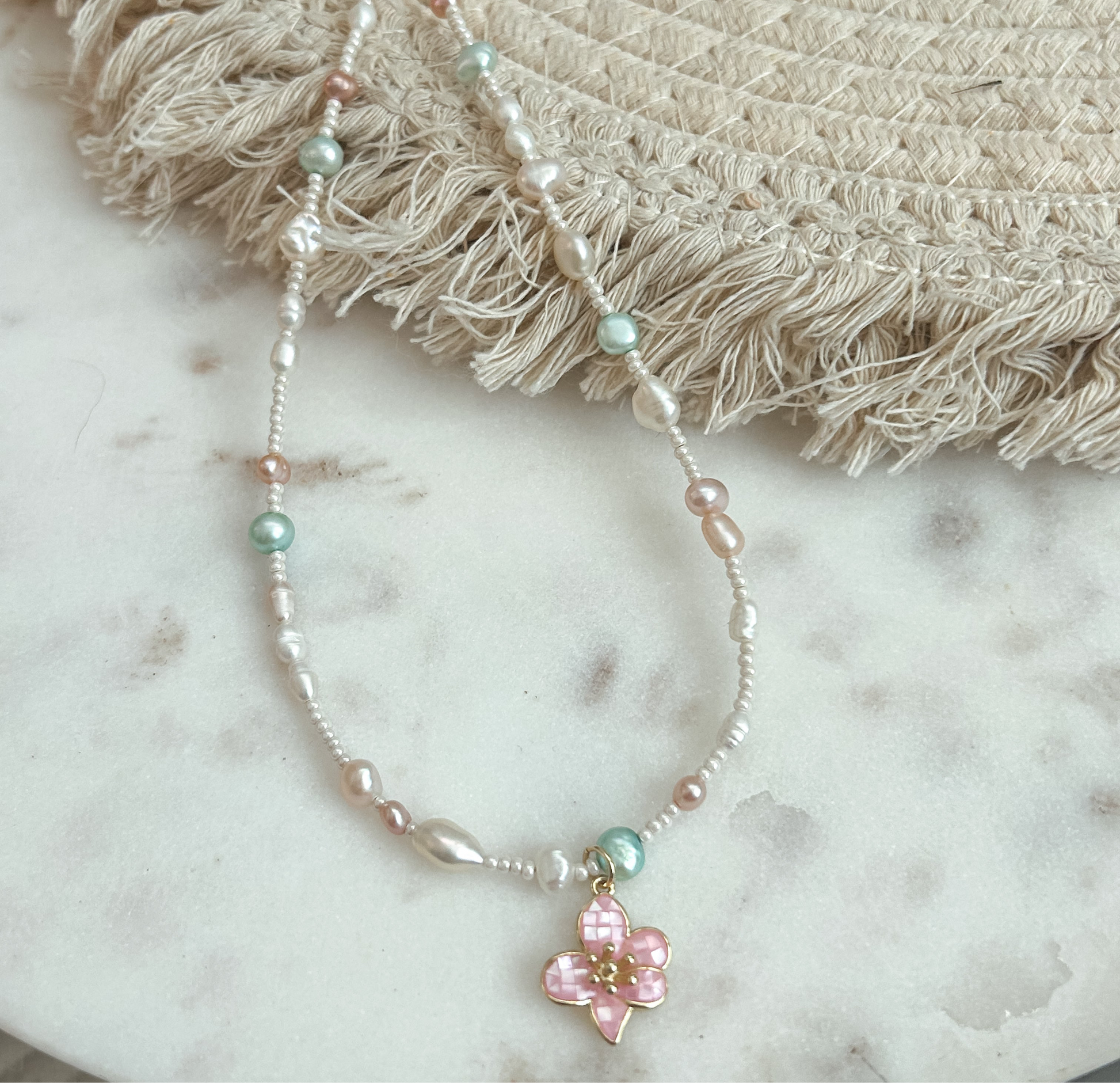 Crafted with seed beads, freshwater pearls, and rice pearls, featuring unique pink and green accents. Each piece is one-of-a-kind, with no two designs alike in the arrangement of pearls and beads.