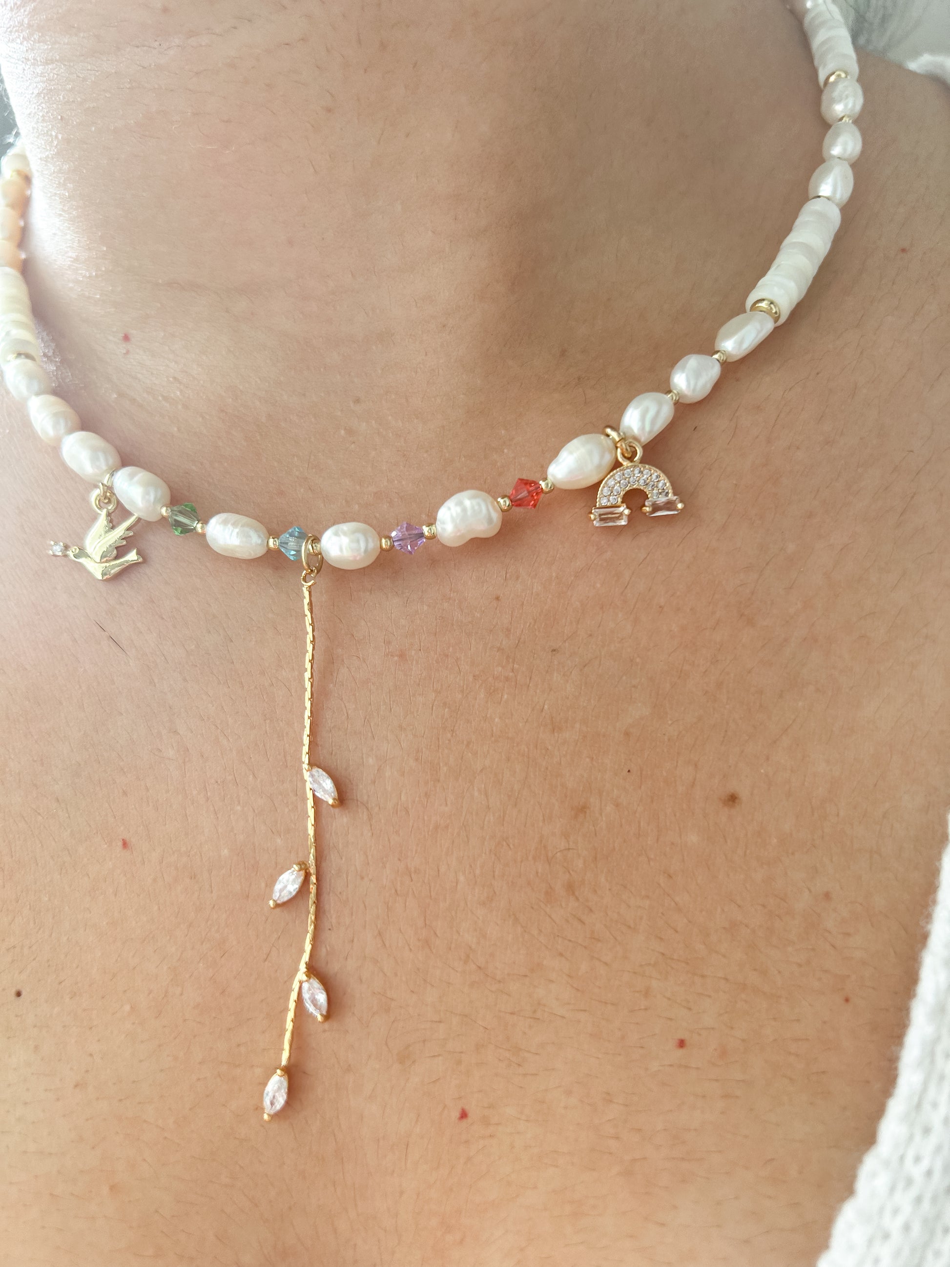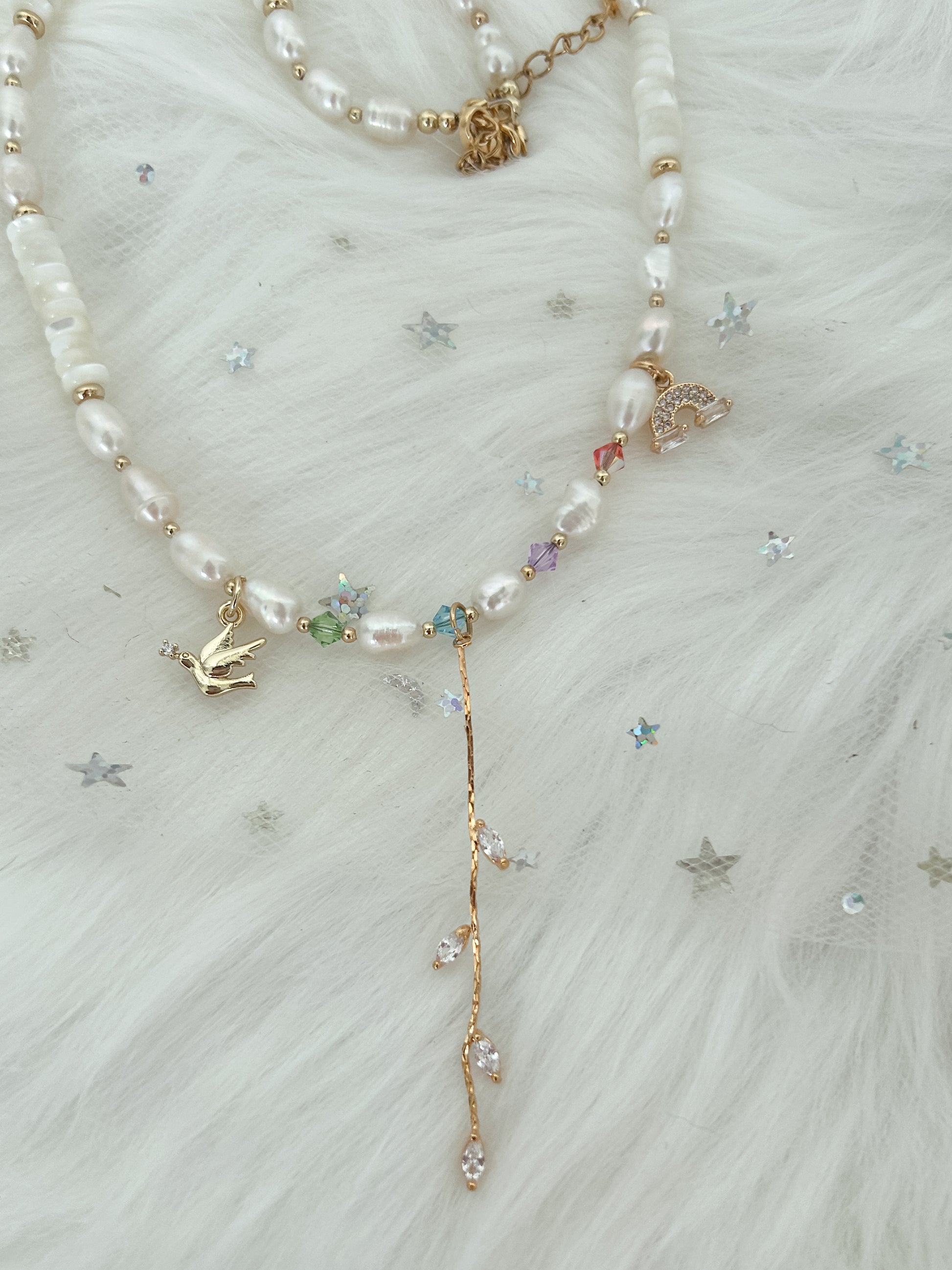 Made with freshwater pearls, mother of pearl beads, gold plated spacers and gold-filled charms, 17 length.