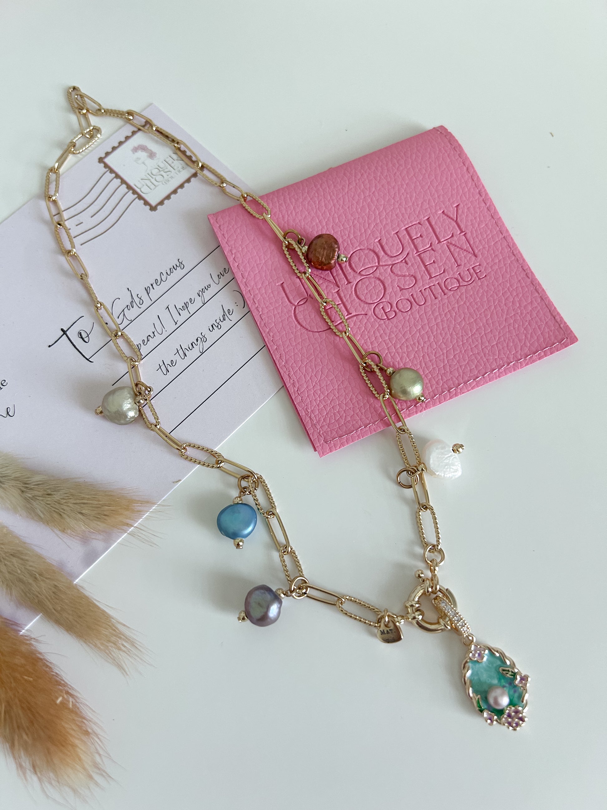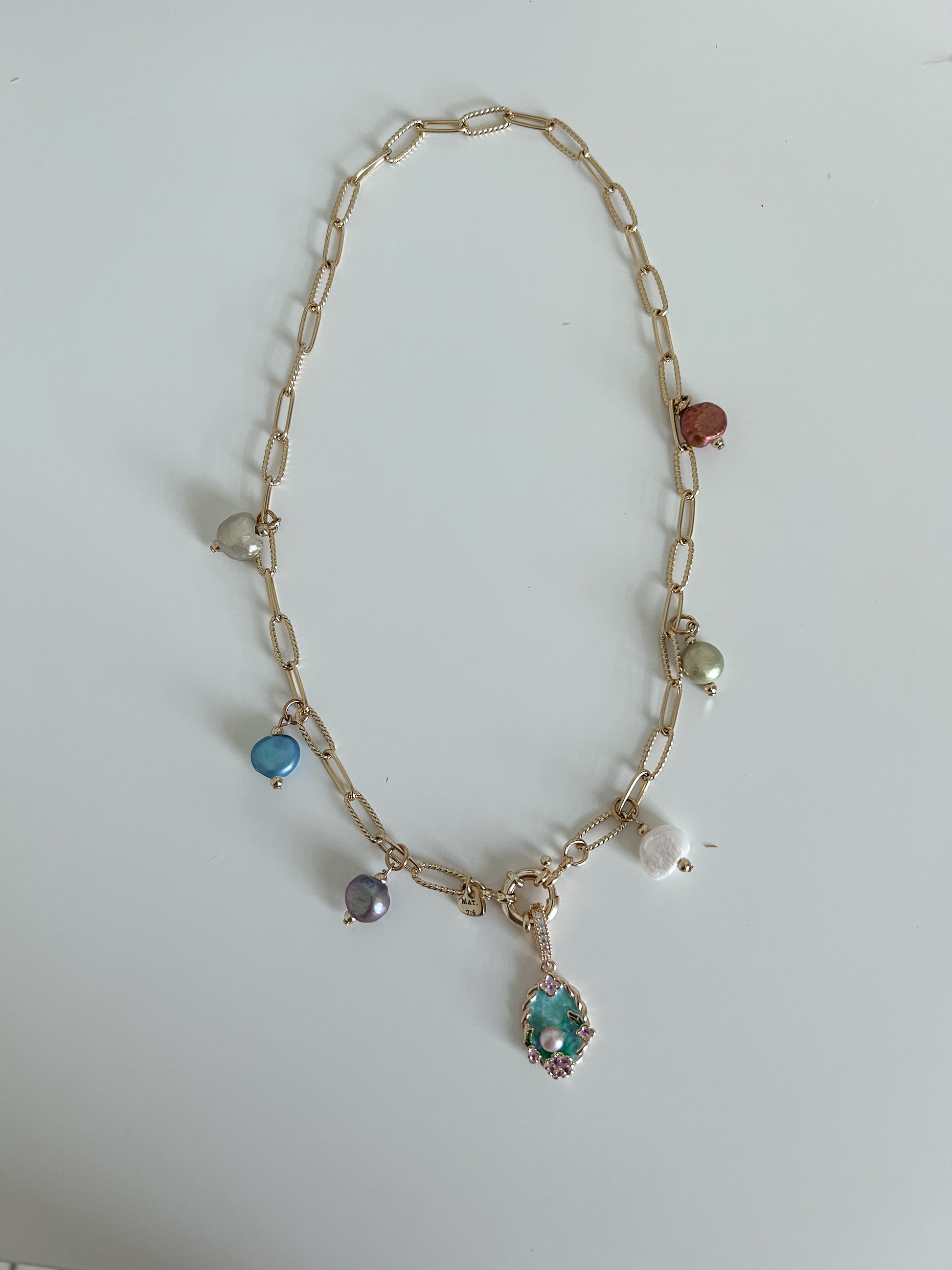 Made with gold-filled chain, clasp and charm with baroque freshwater pearls. 17”