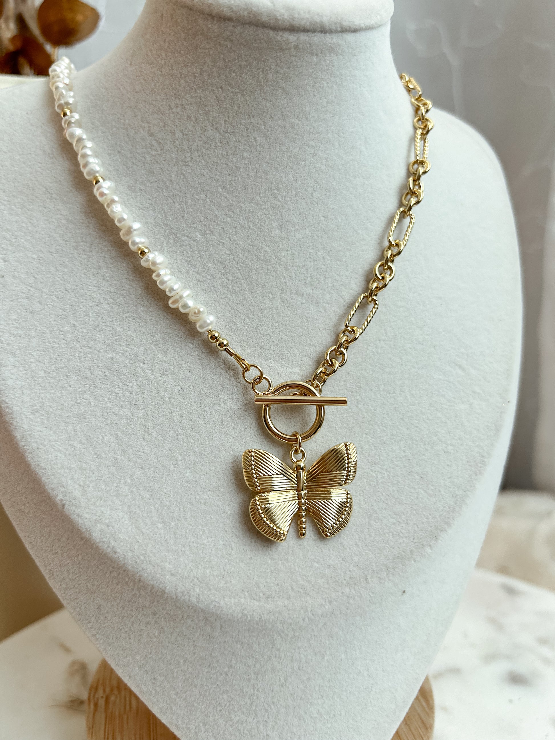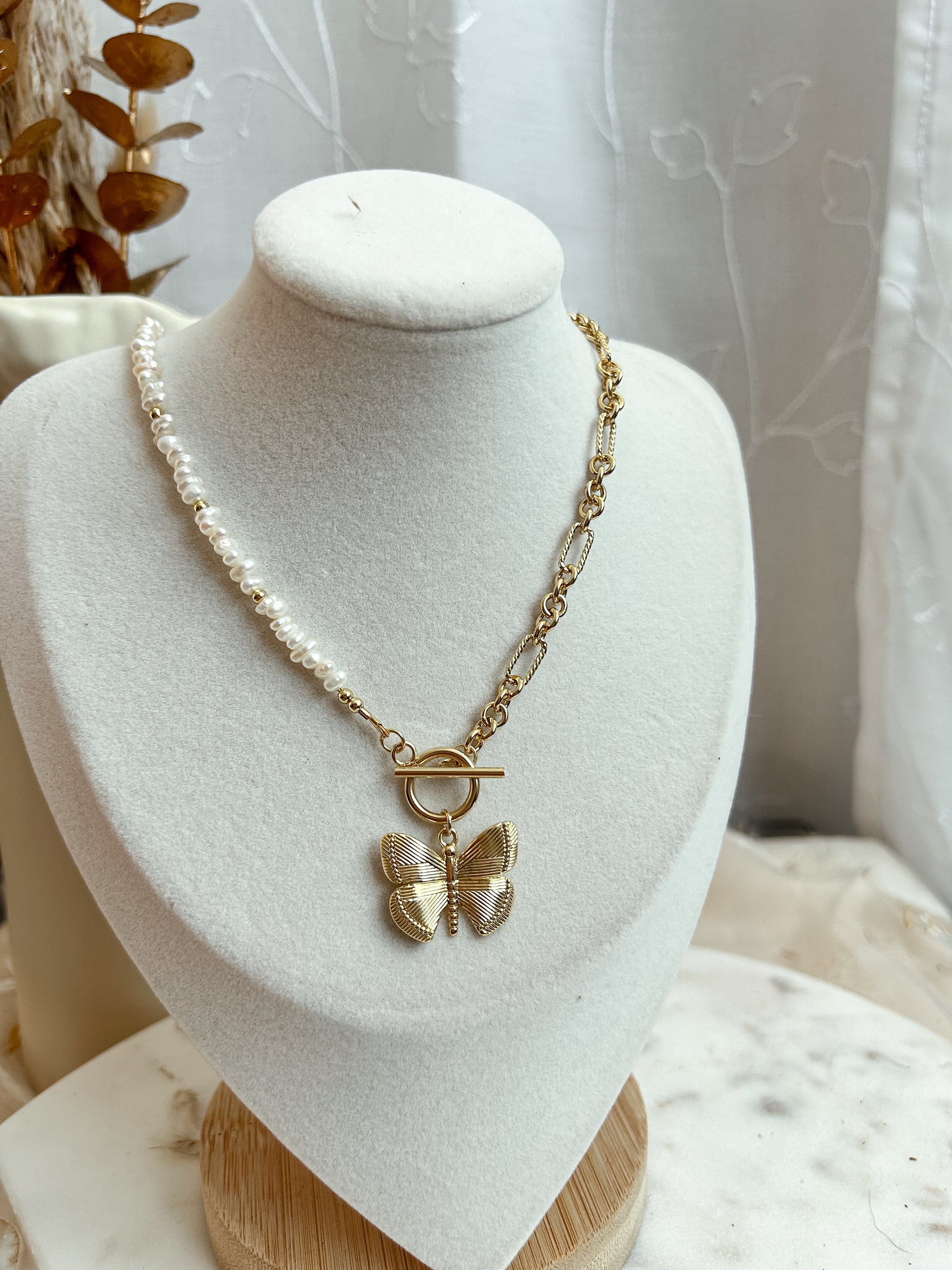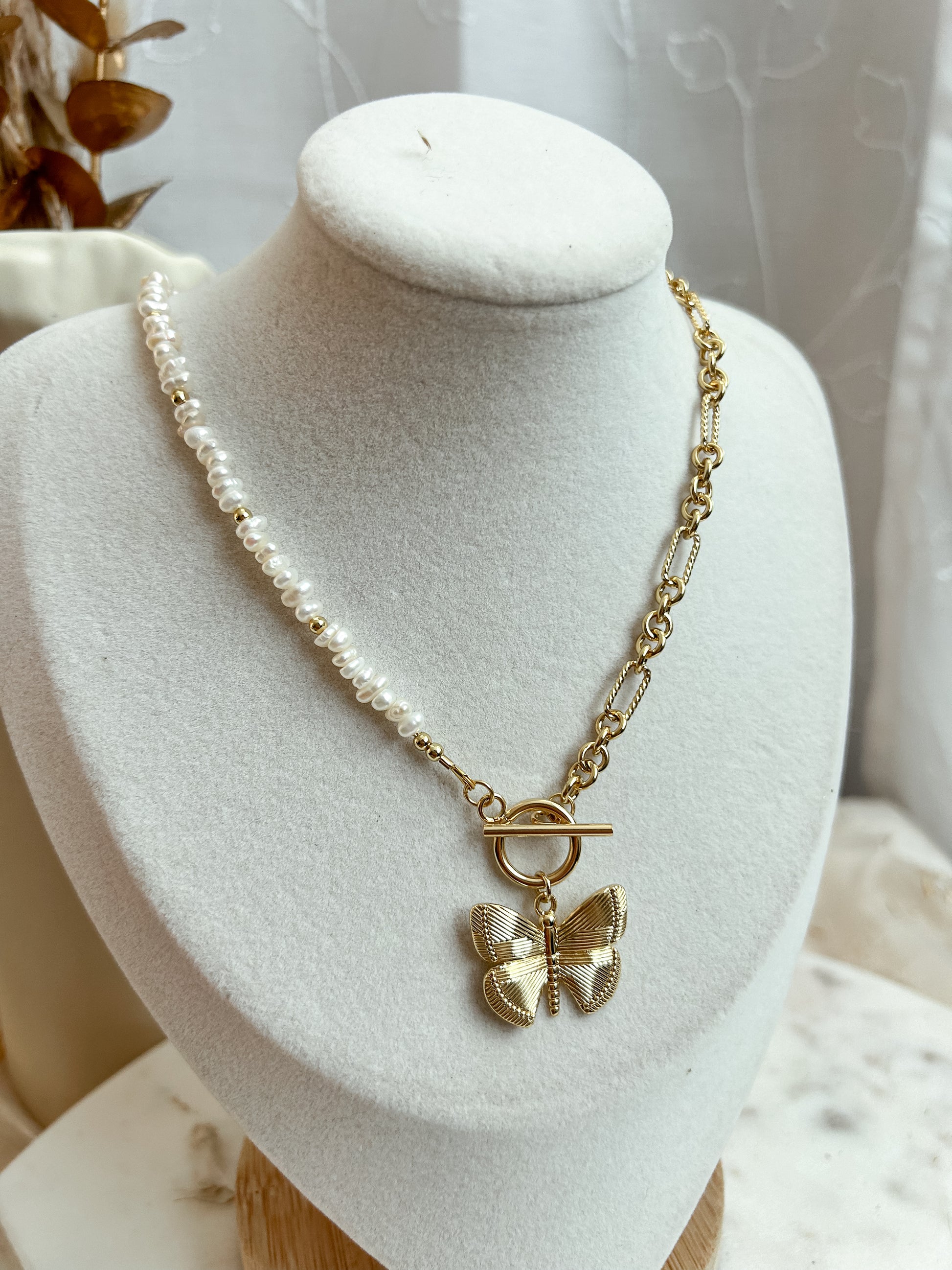 White fresh water pearls with a gold plated butterfly and gold-filled chain.