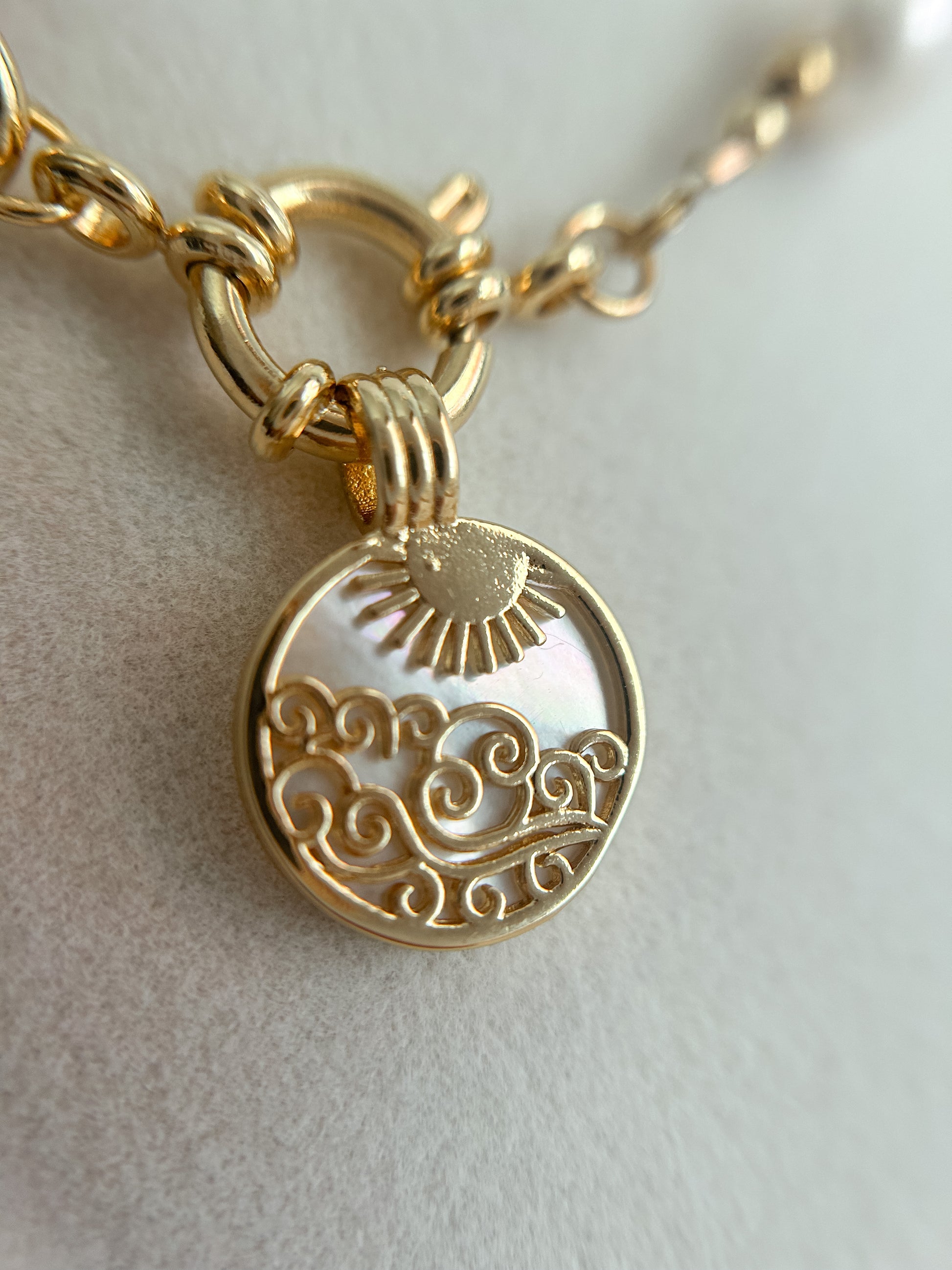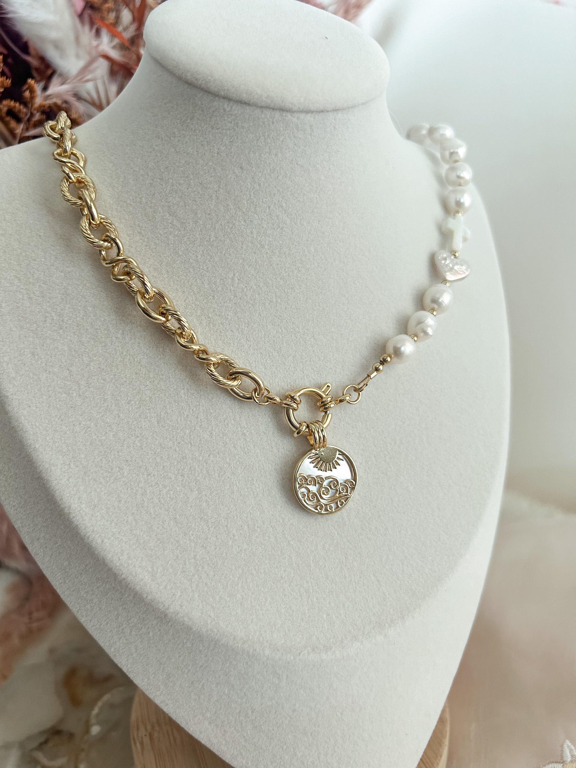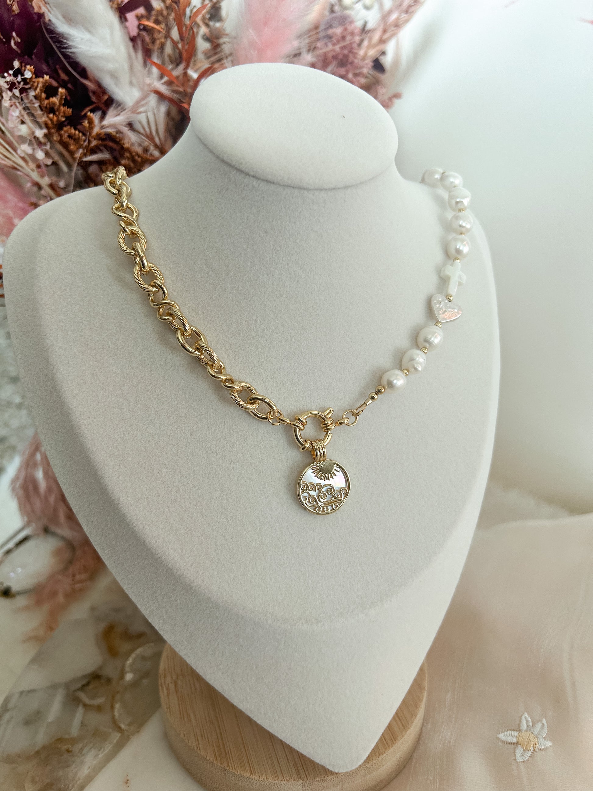 Made with freshwater pearls, mother of pearl cross, pearl heart, gold filled spacers and gold filled chunky chain.