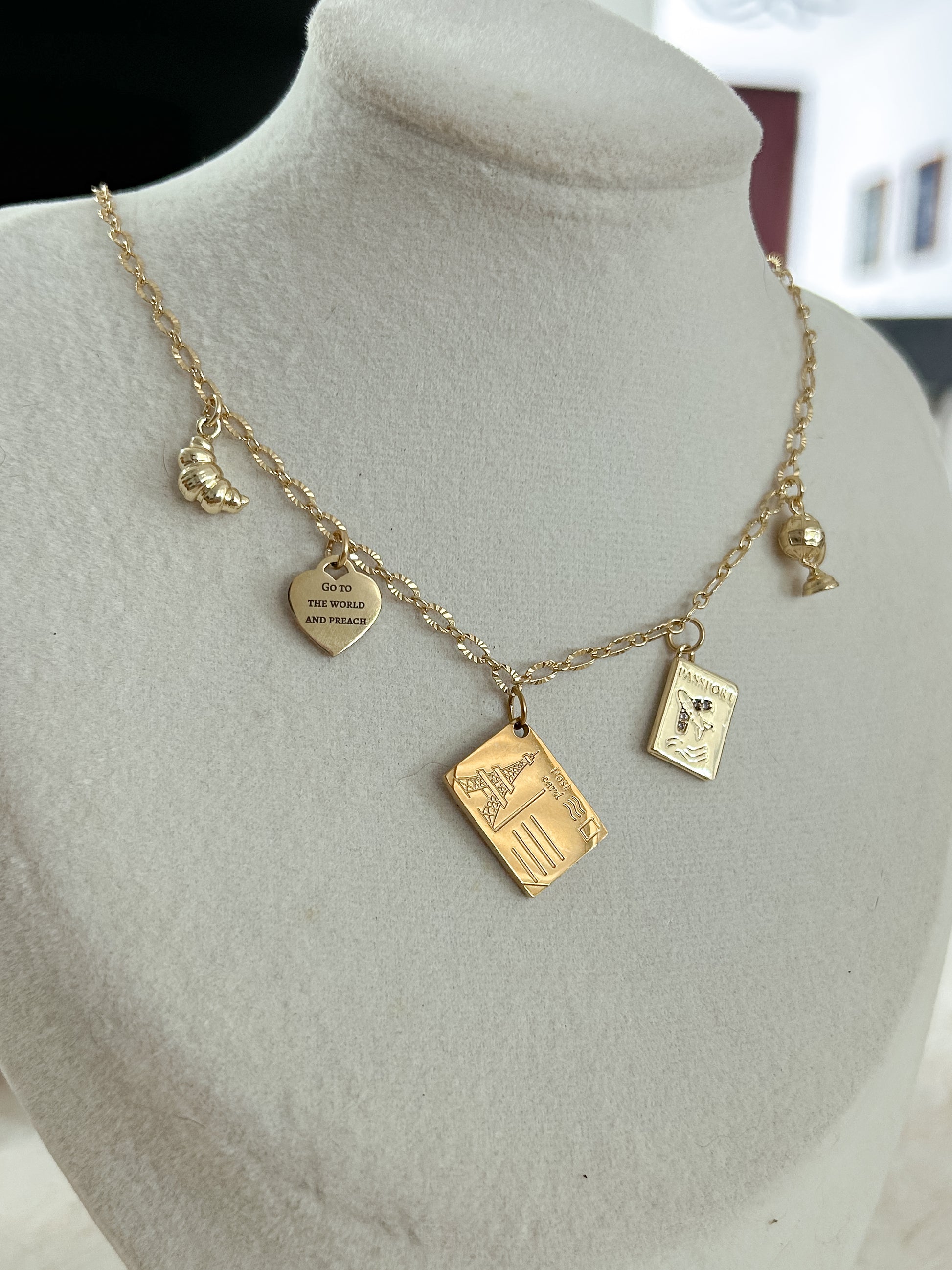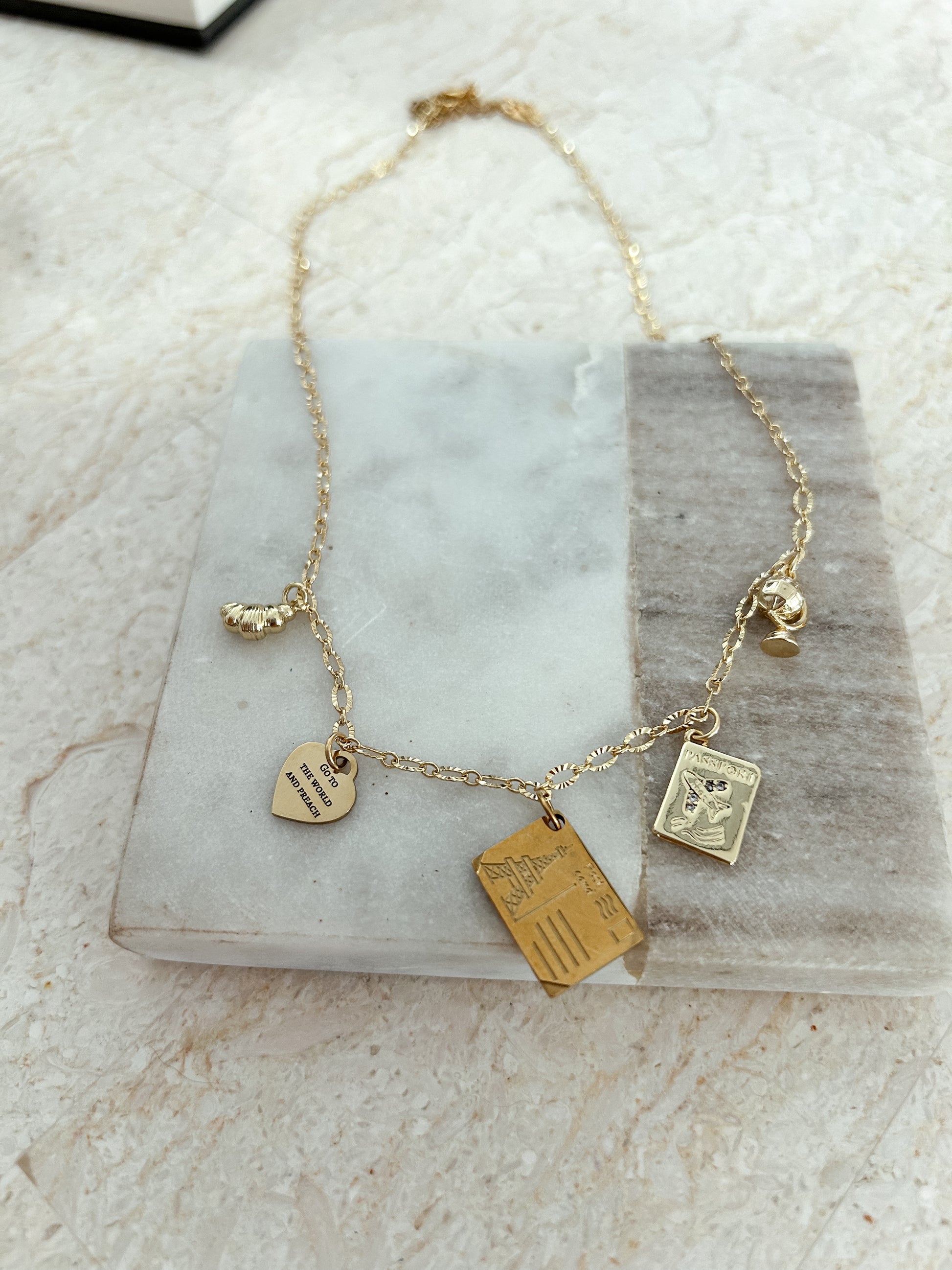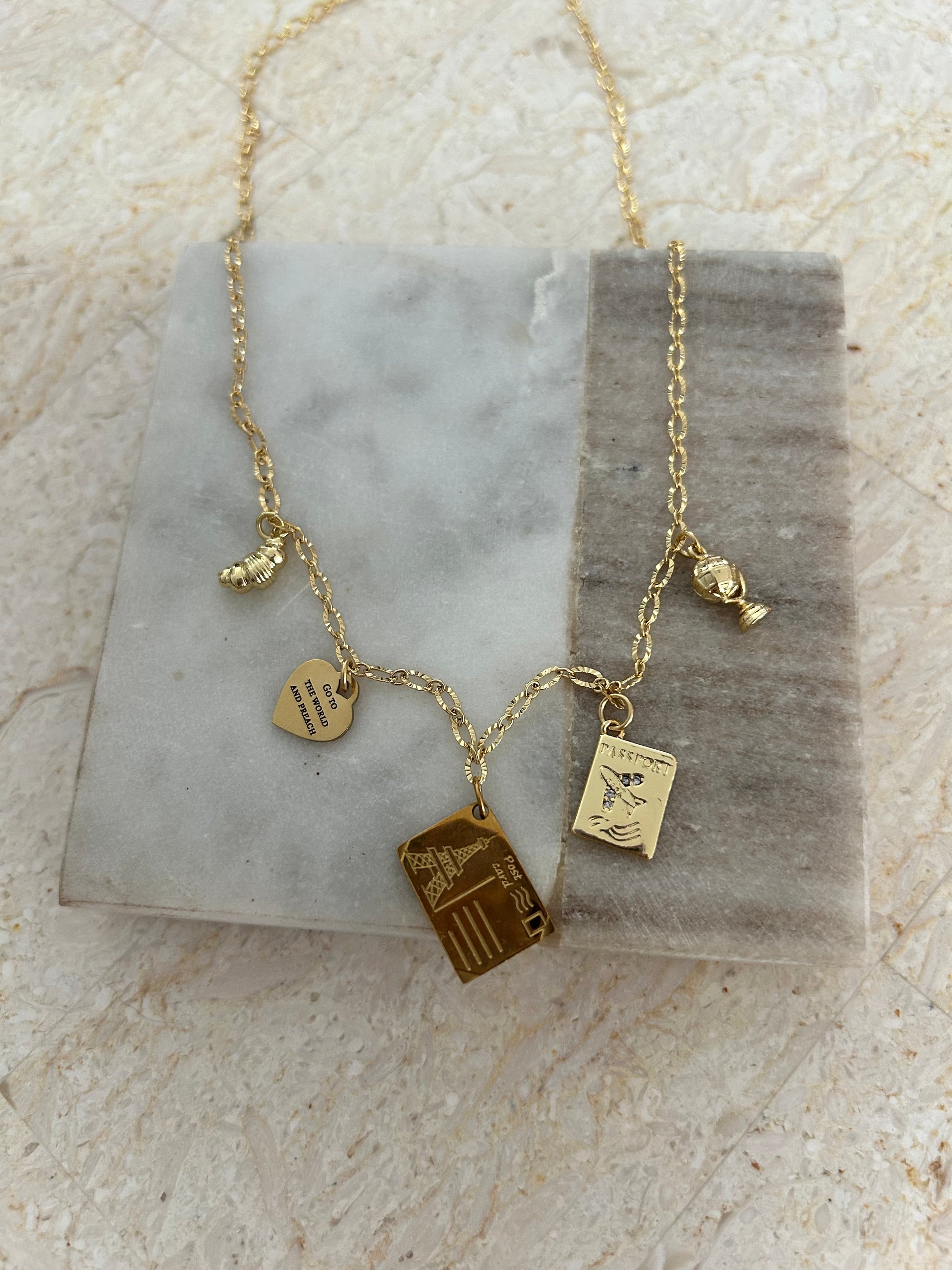 Stainless steel chain and charms. Length 17 inches.