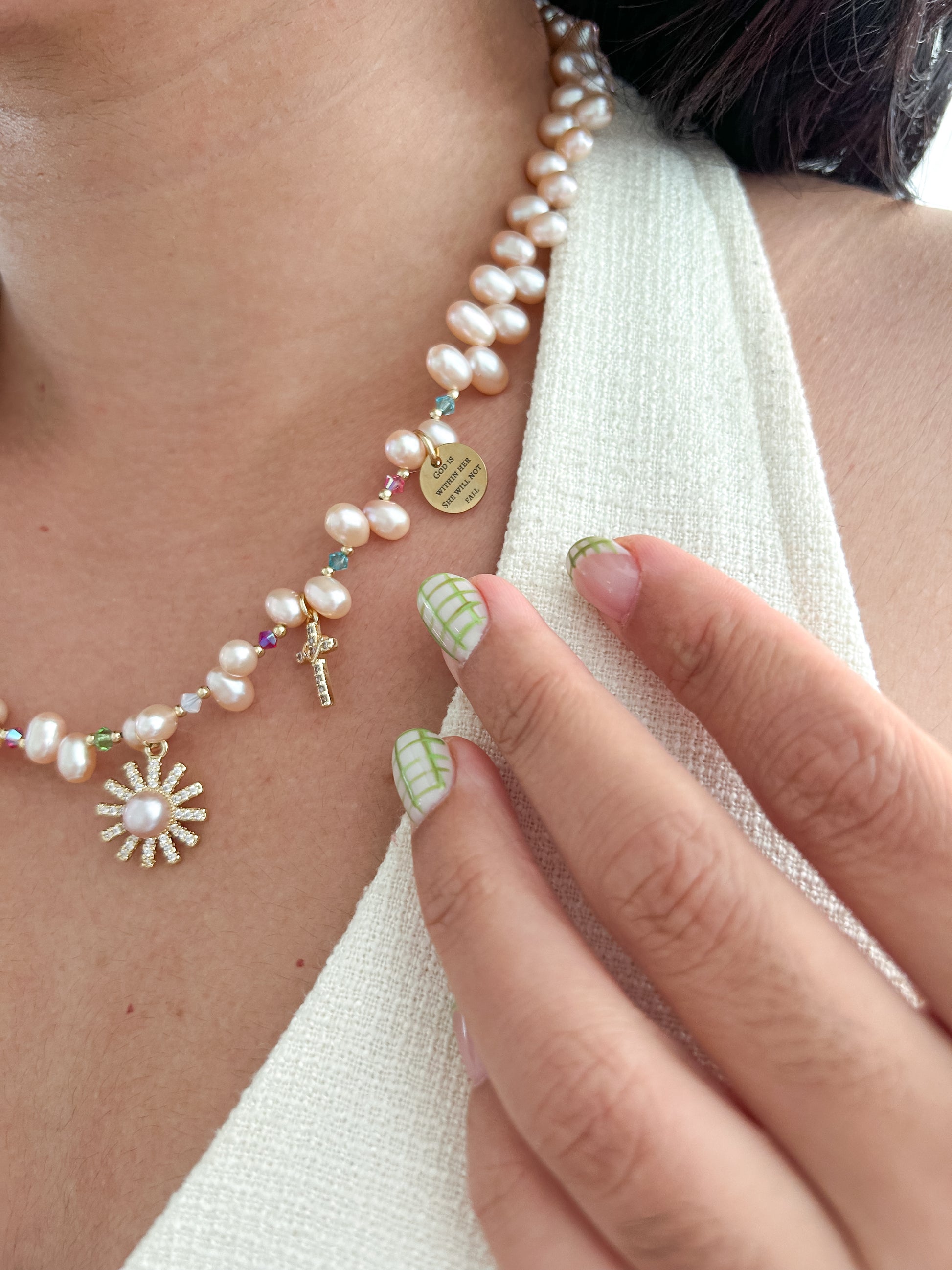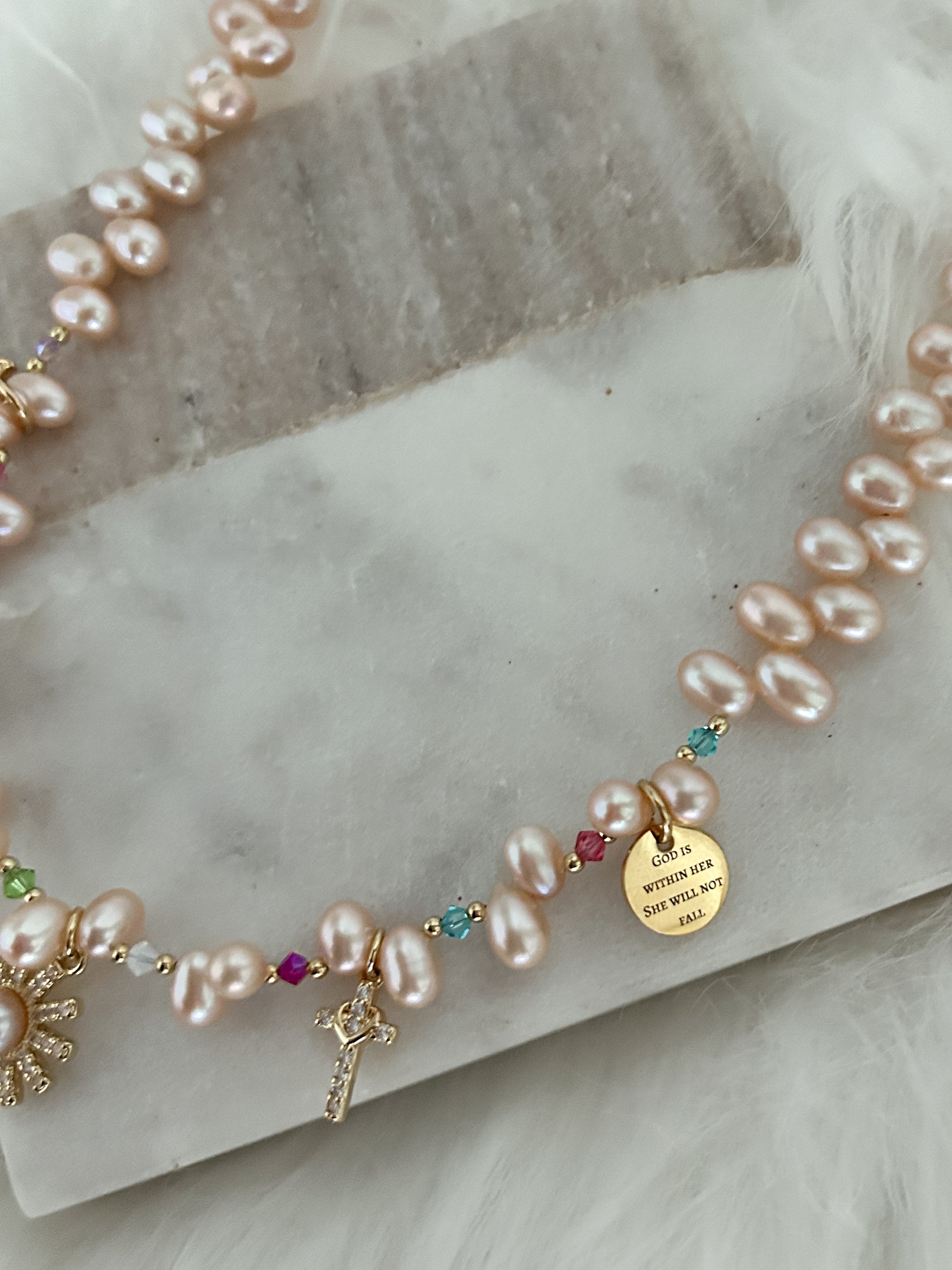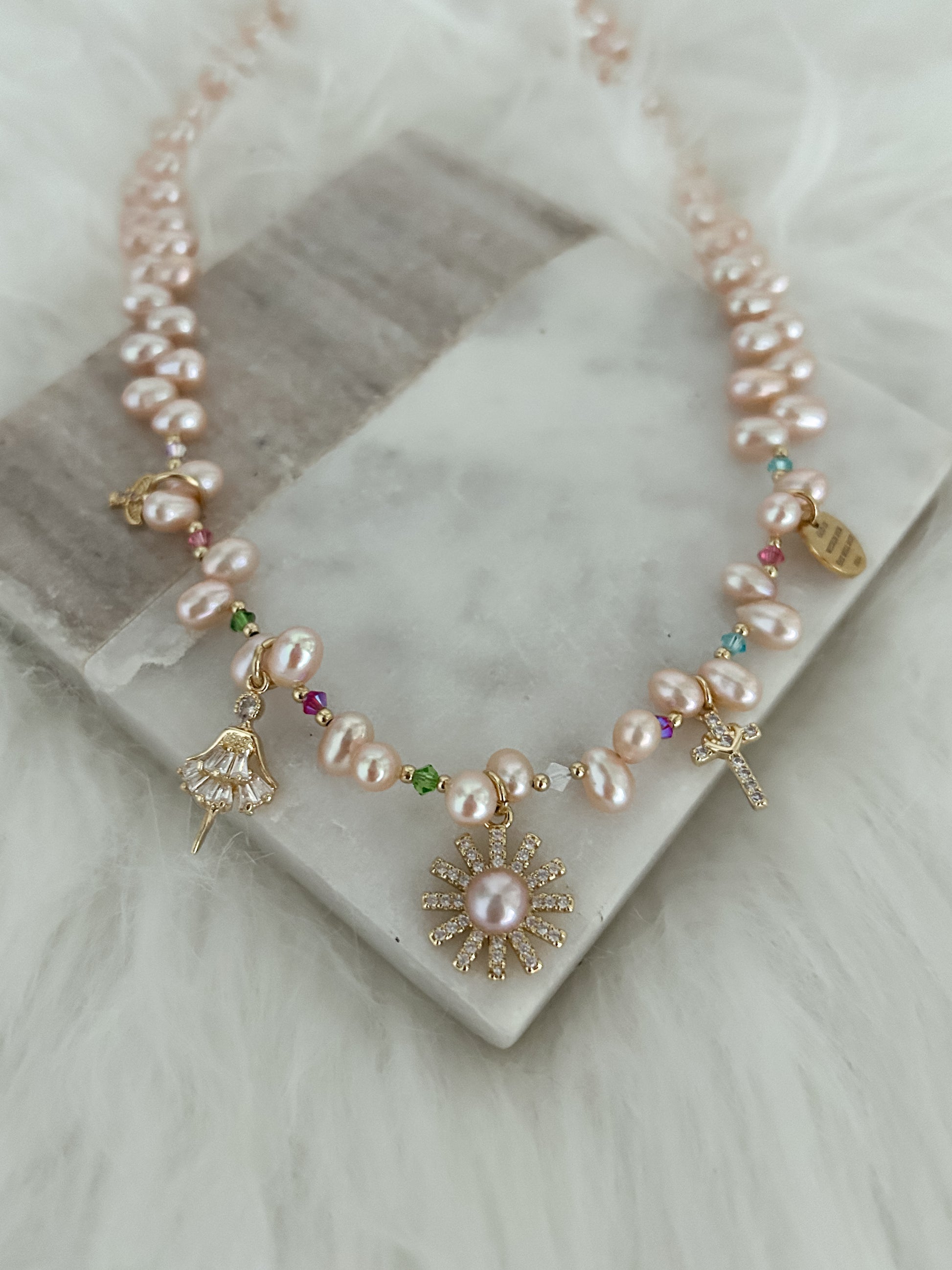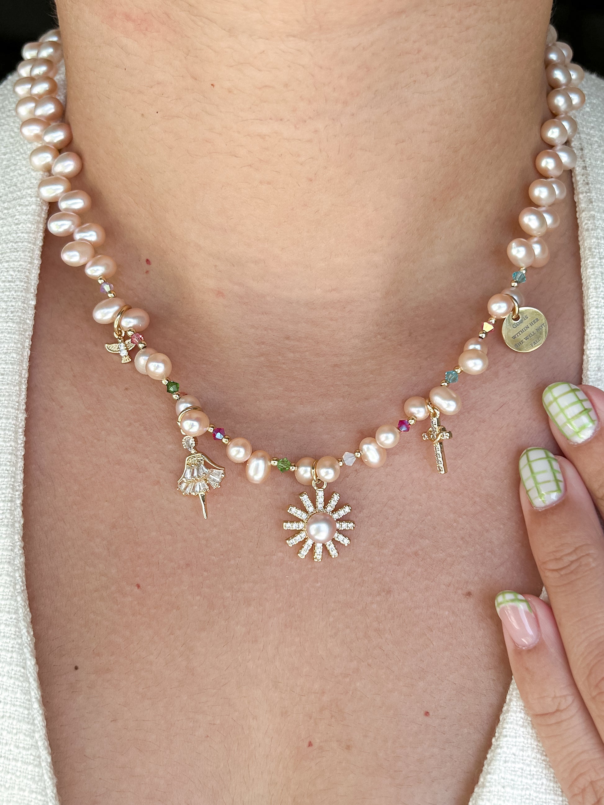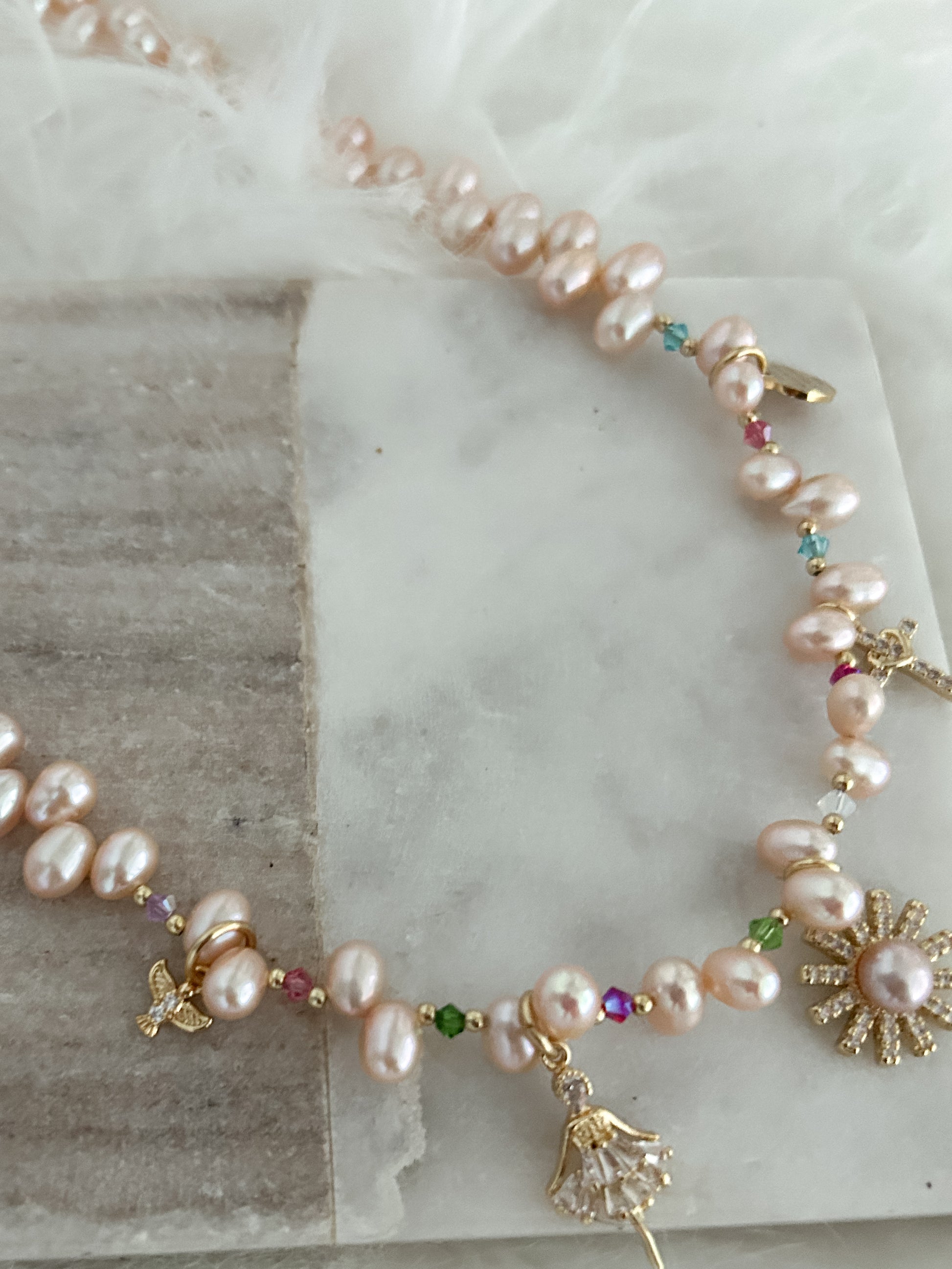 Made with soft pink freshwater pearls, gold-filled charms, Swarovski beads and stainless steel endings.