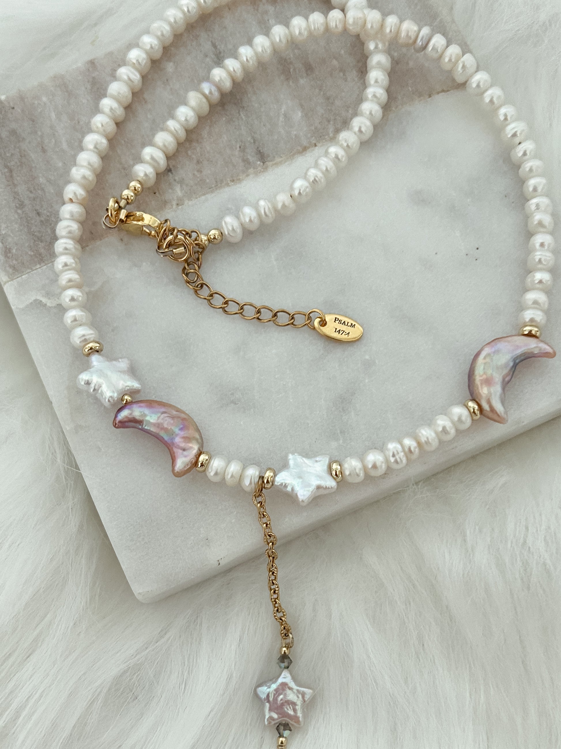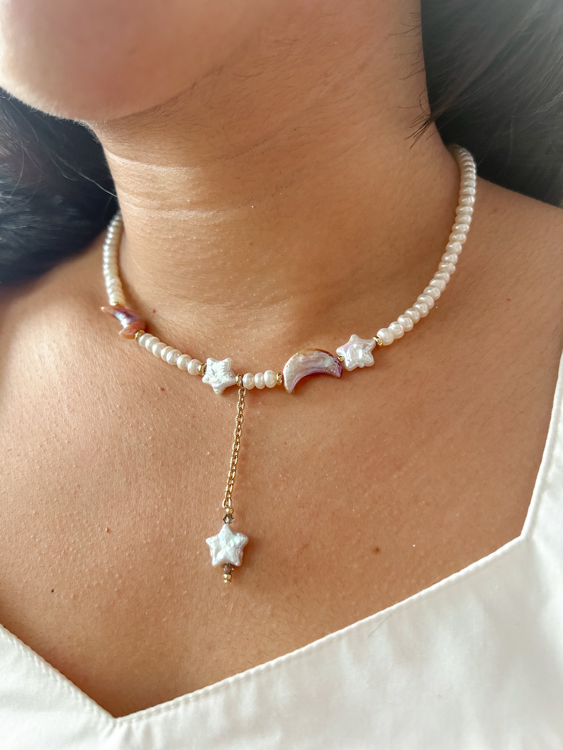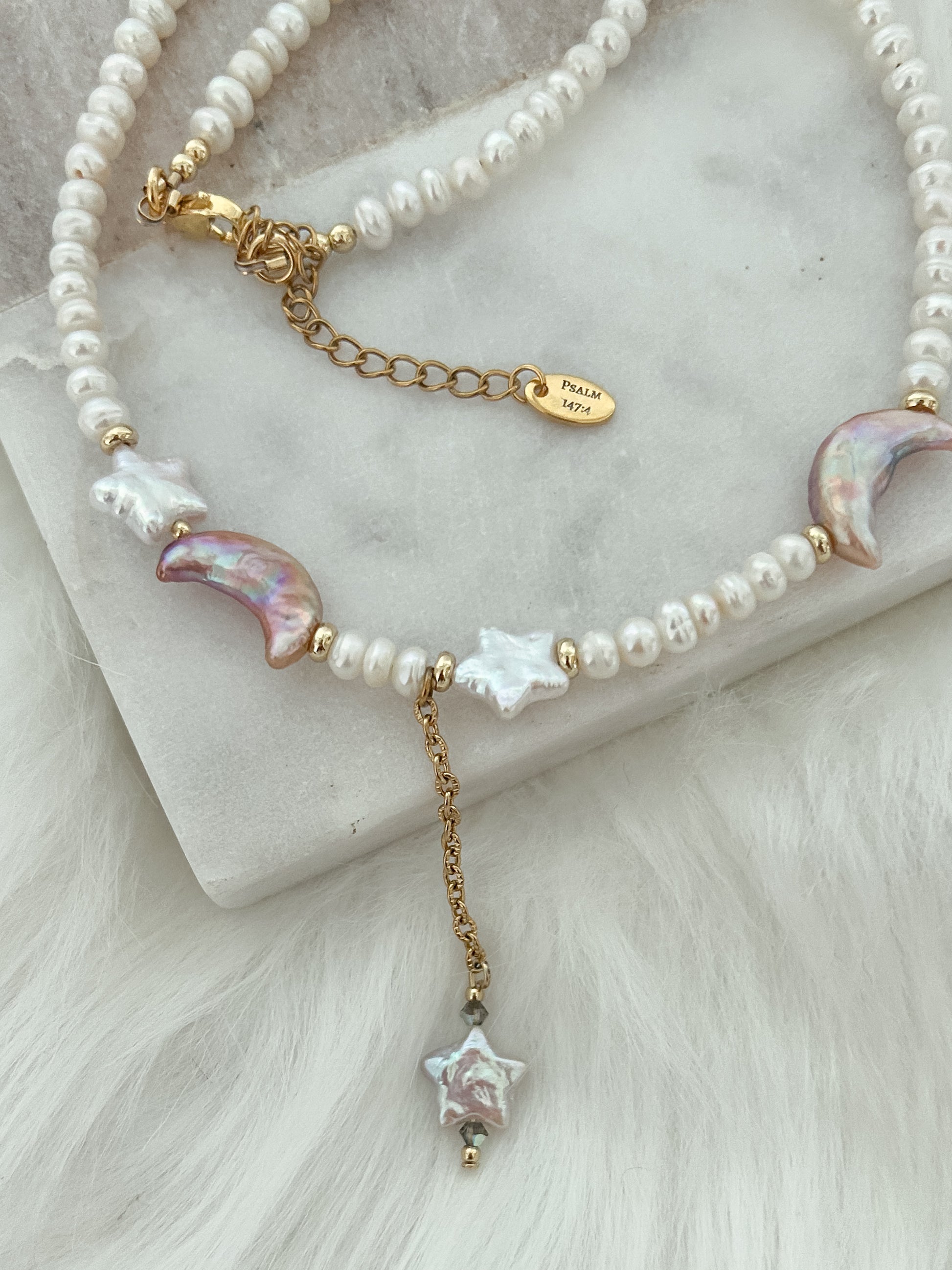 Crafted with freshwater coin pearls, star- and moon-shaped pearls, and stainless steel findings, this 17-inch necklace is both elegant and durable.