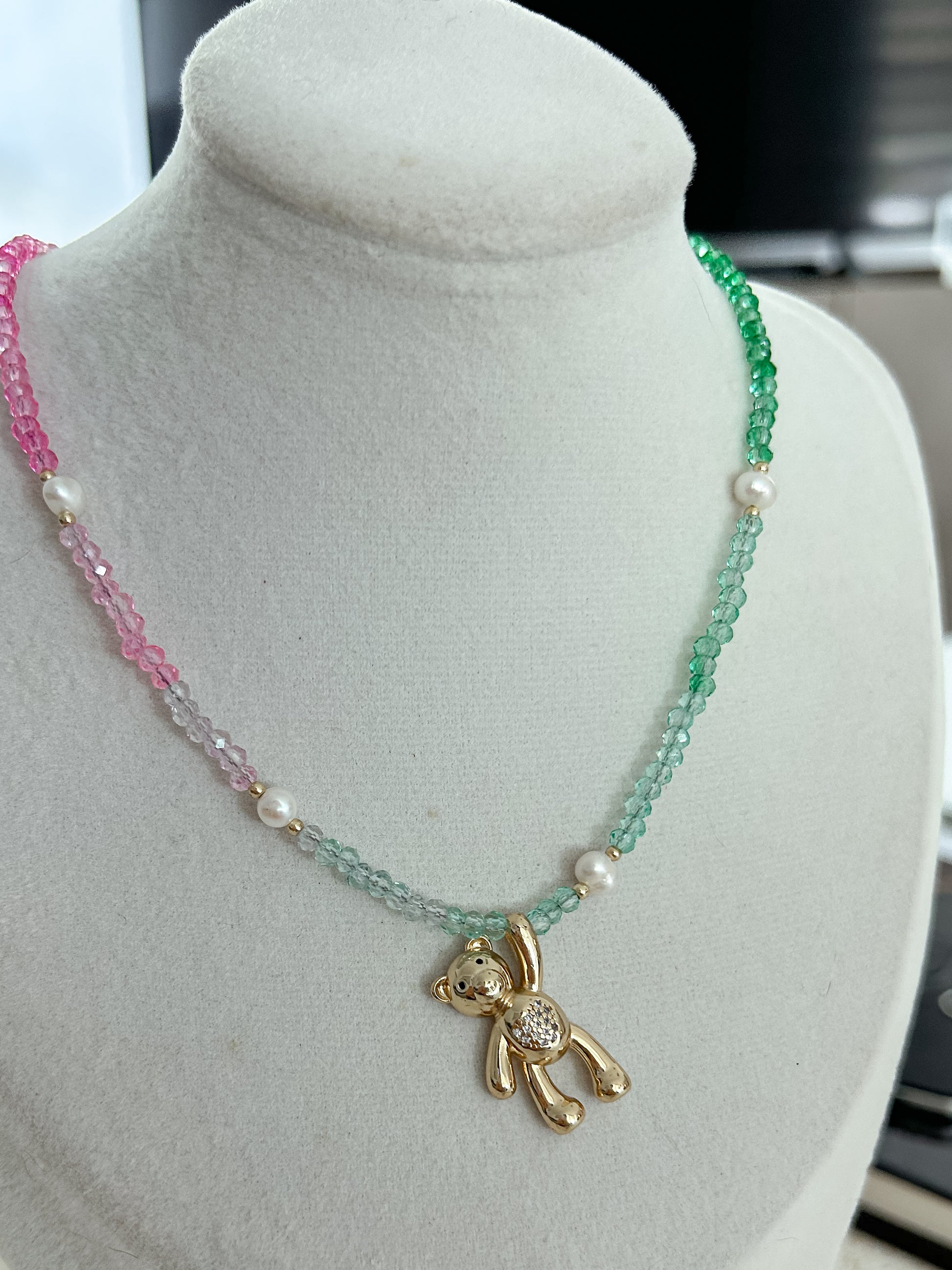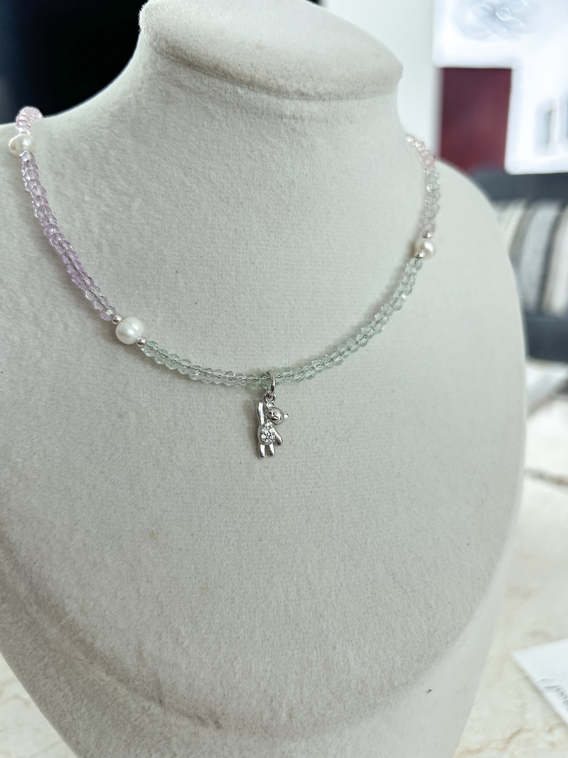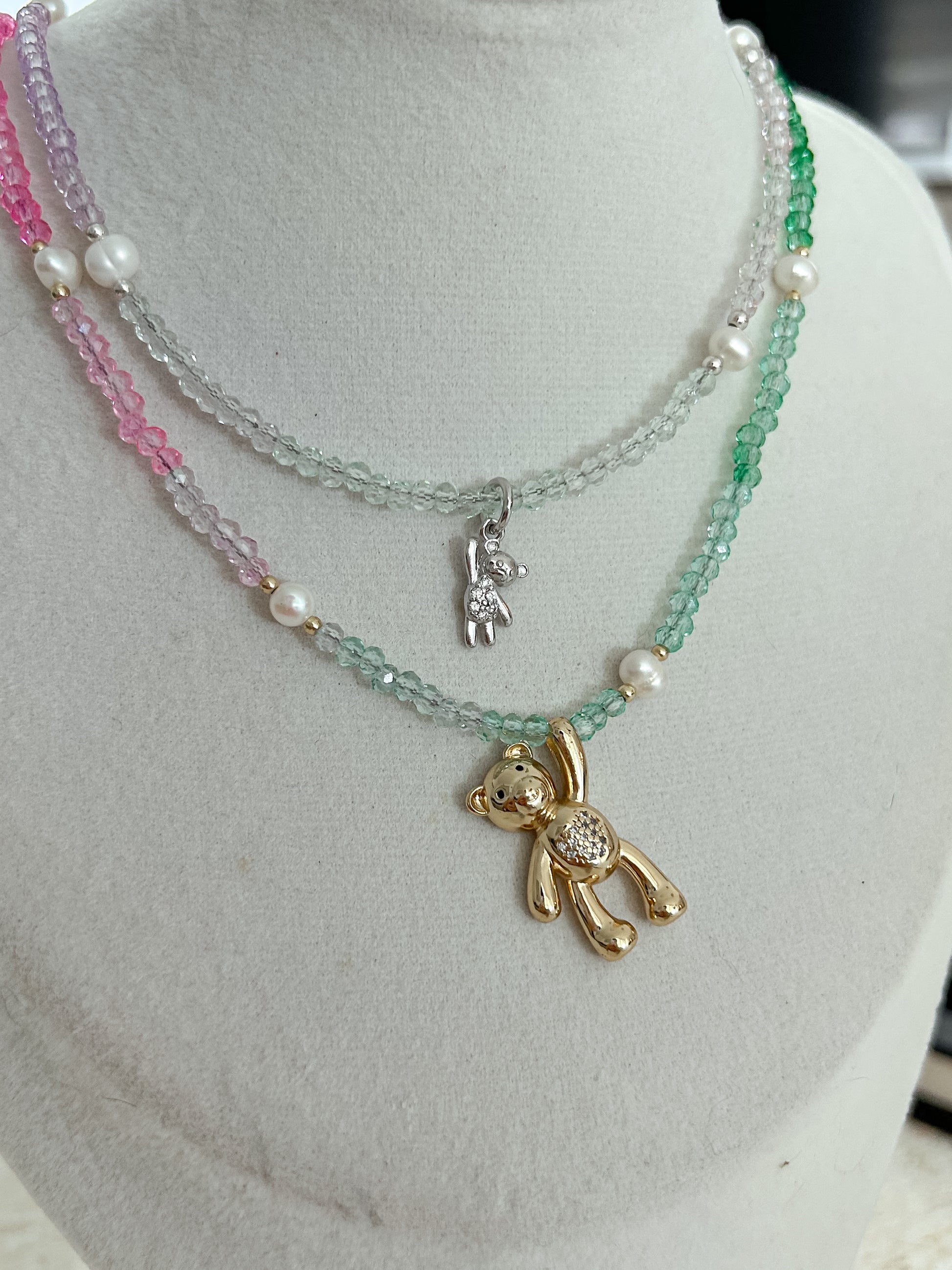 Crystal beads, stainless steel teddy and endings, fresh water pearls.
