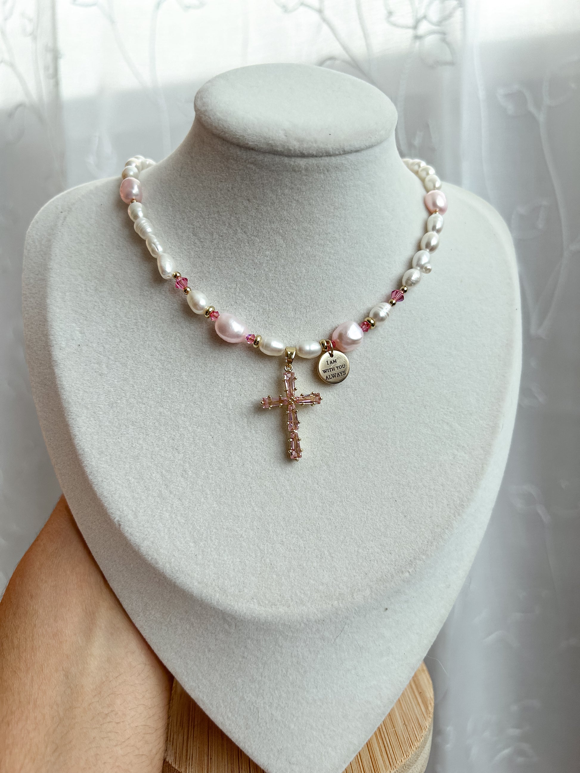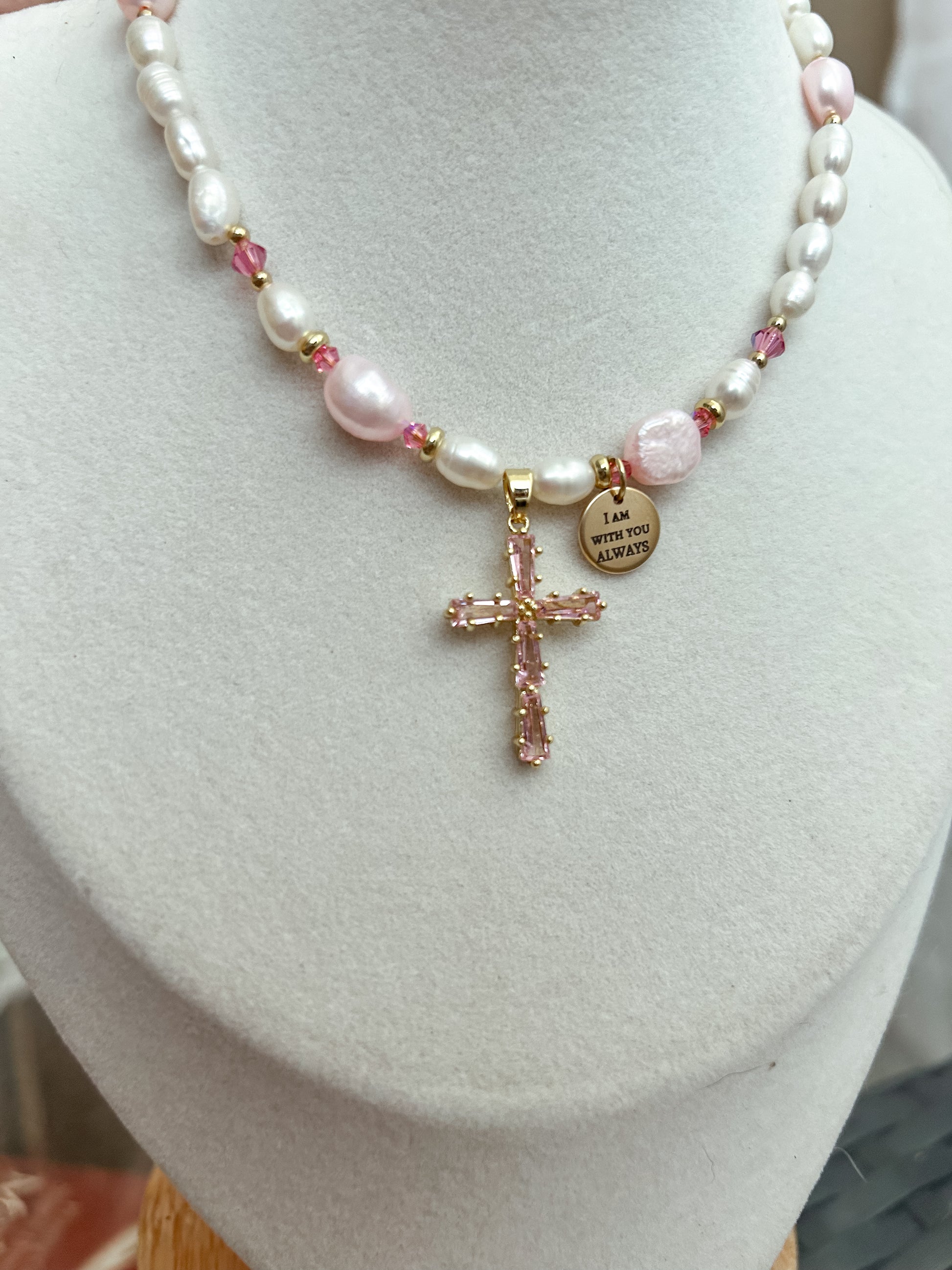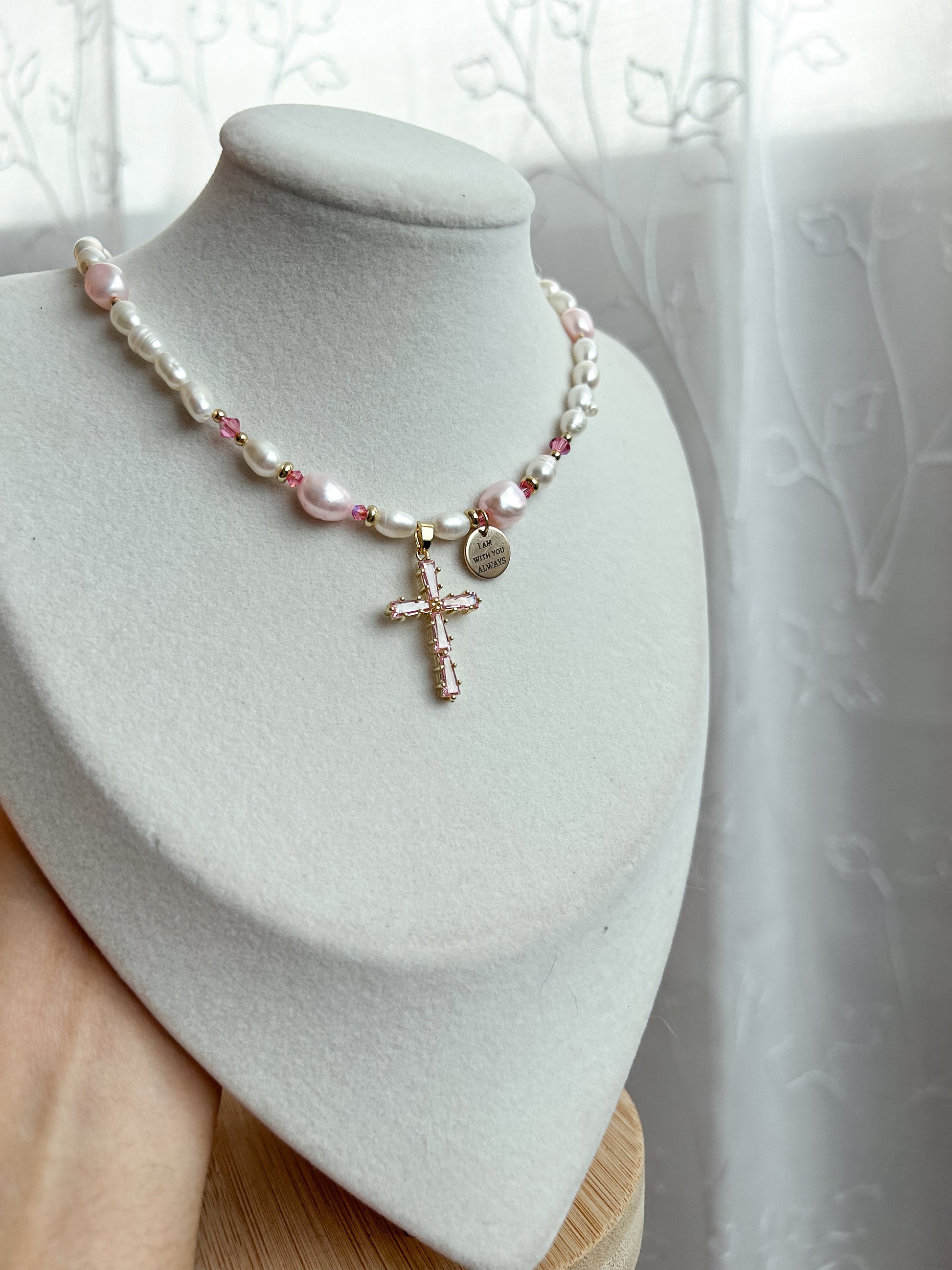 Made with freshwater pearls, pink Swarovski and gold filled zirconia cross. 17”