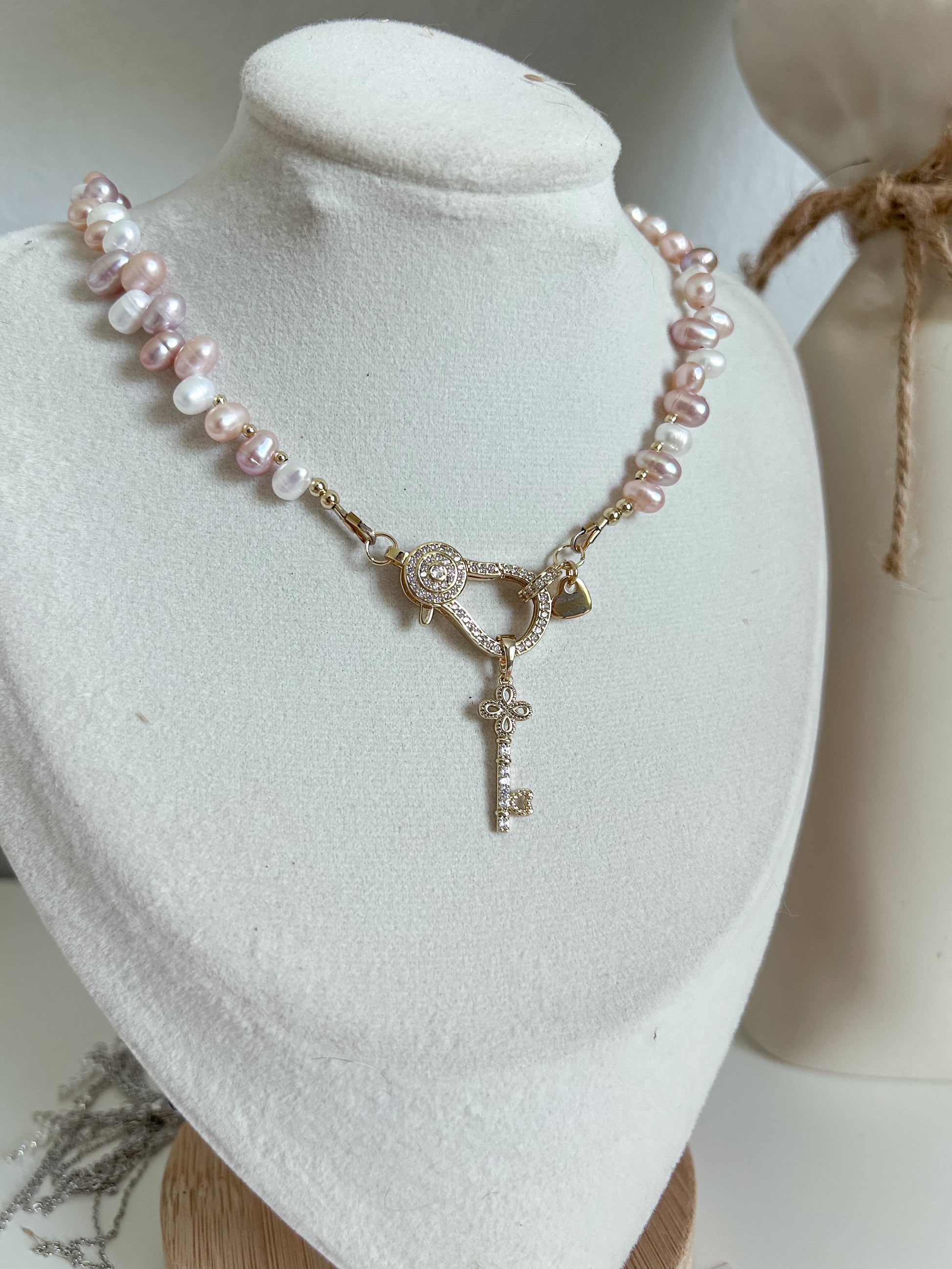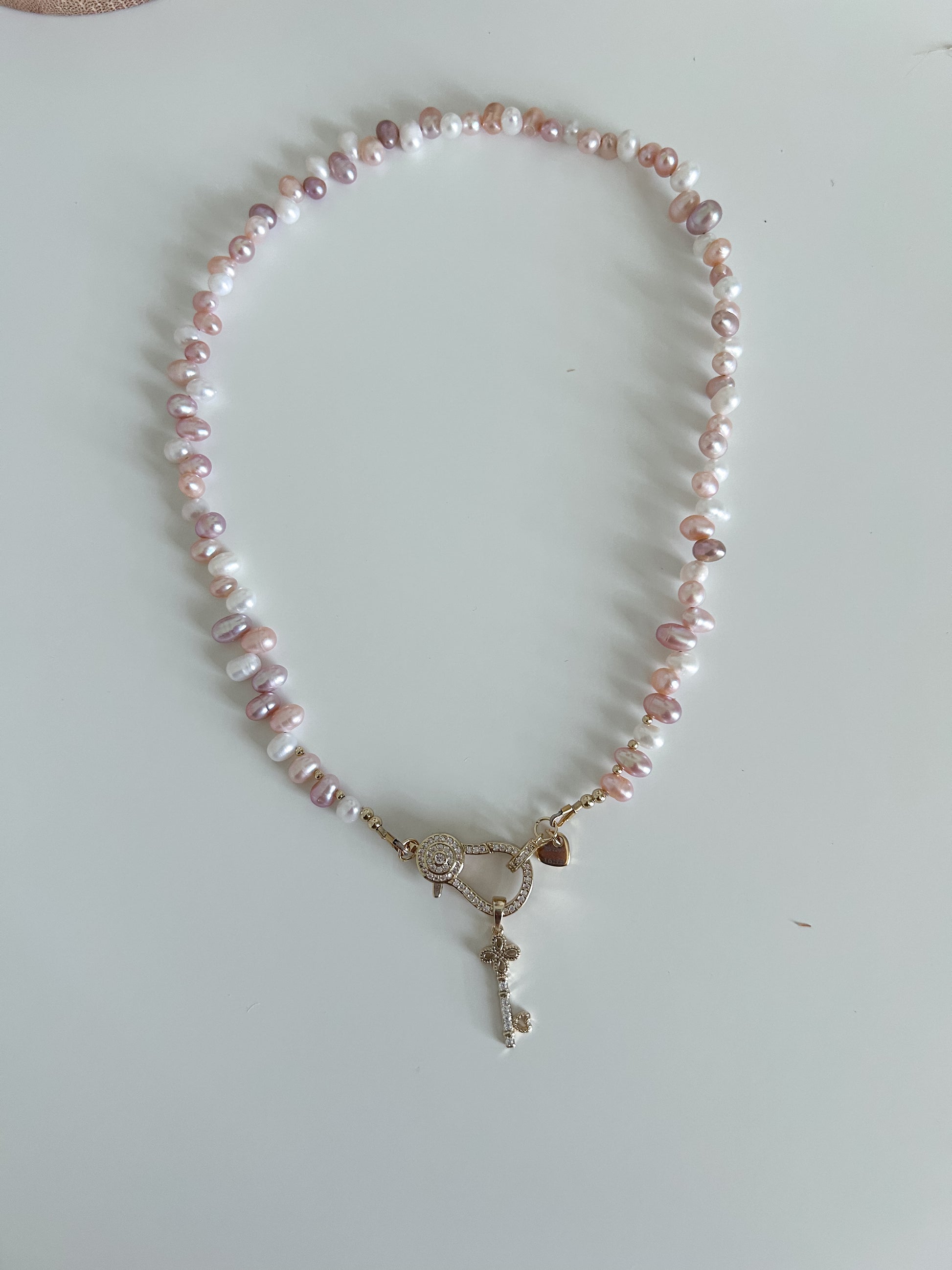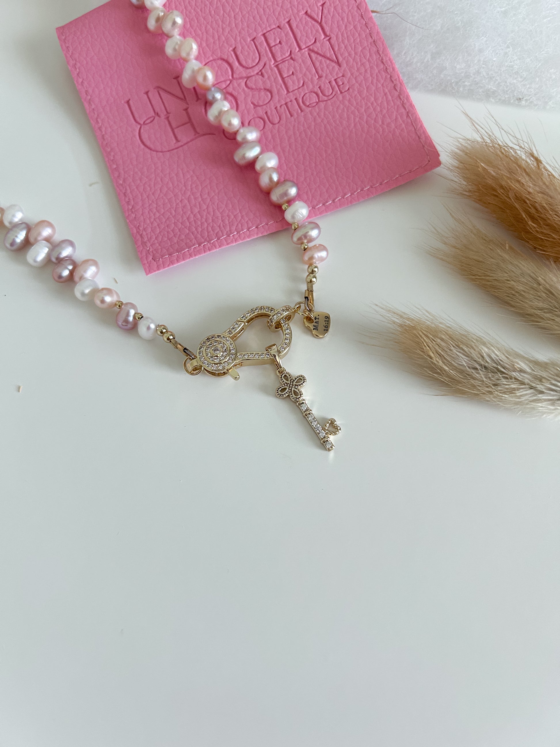 Made with freshwater pearls, gold-plated zirconia clasp and a gold-filled zirconia key charm. 16”