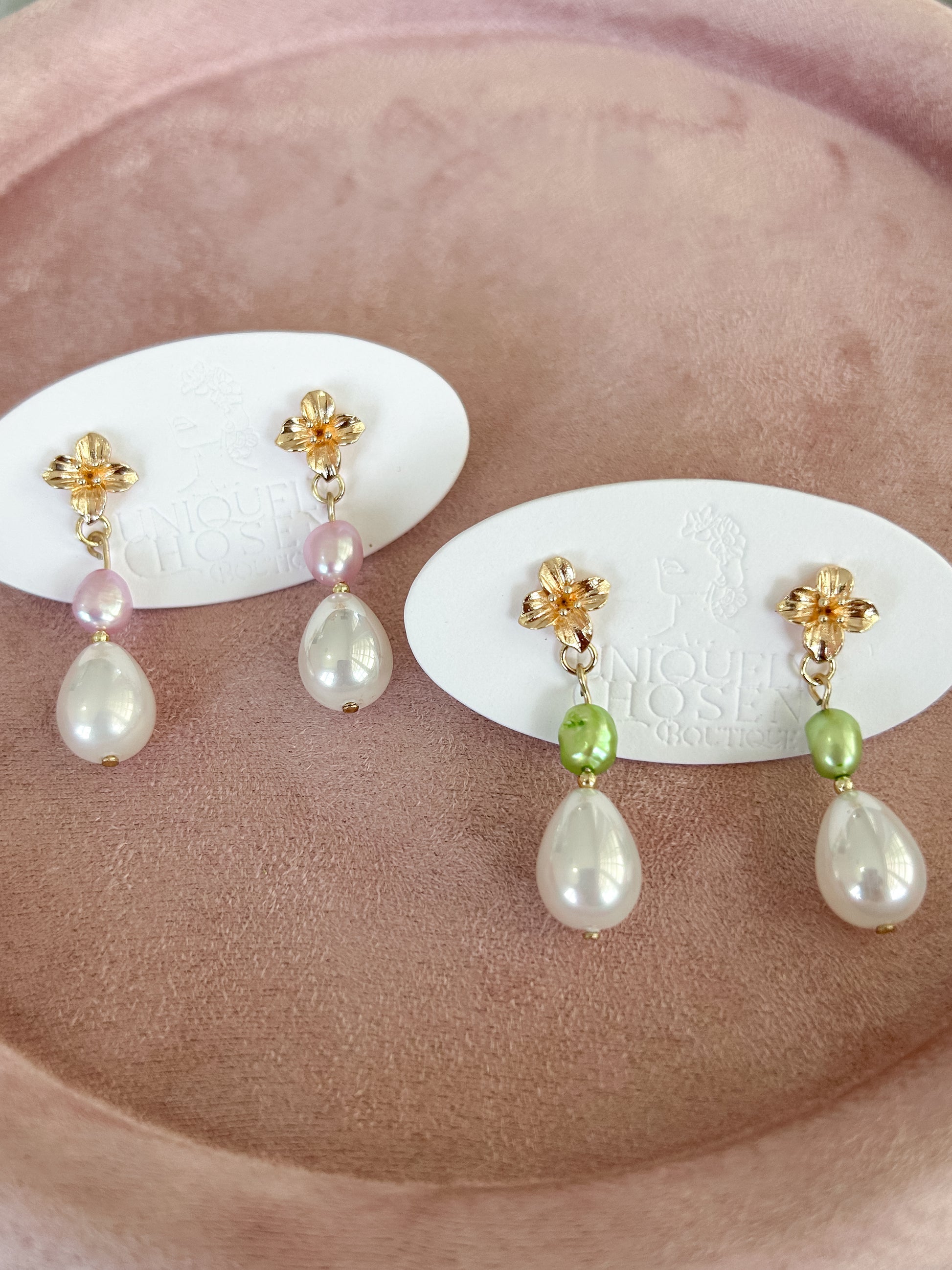 Made with imitation pearl (white) and freshwater pearls (green & purple) gold-plated flower earring.
