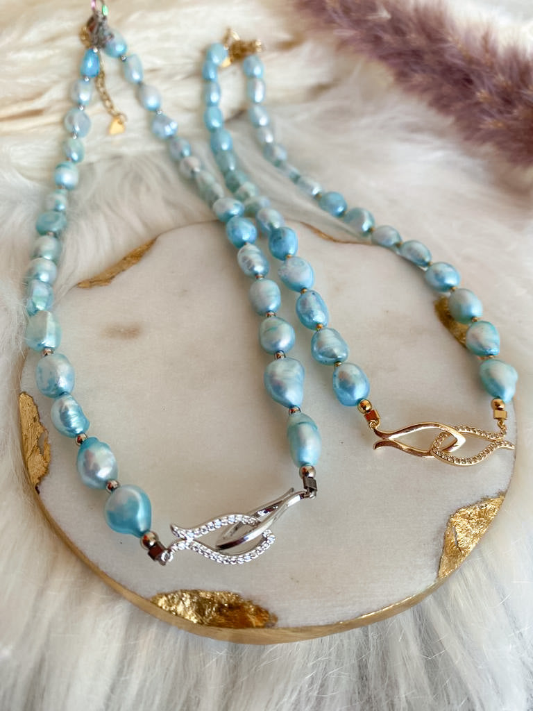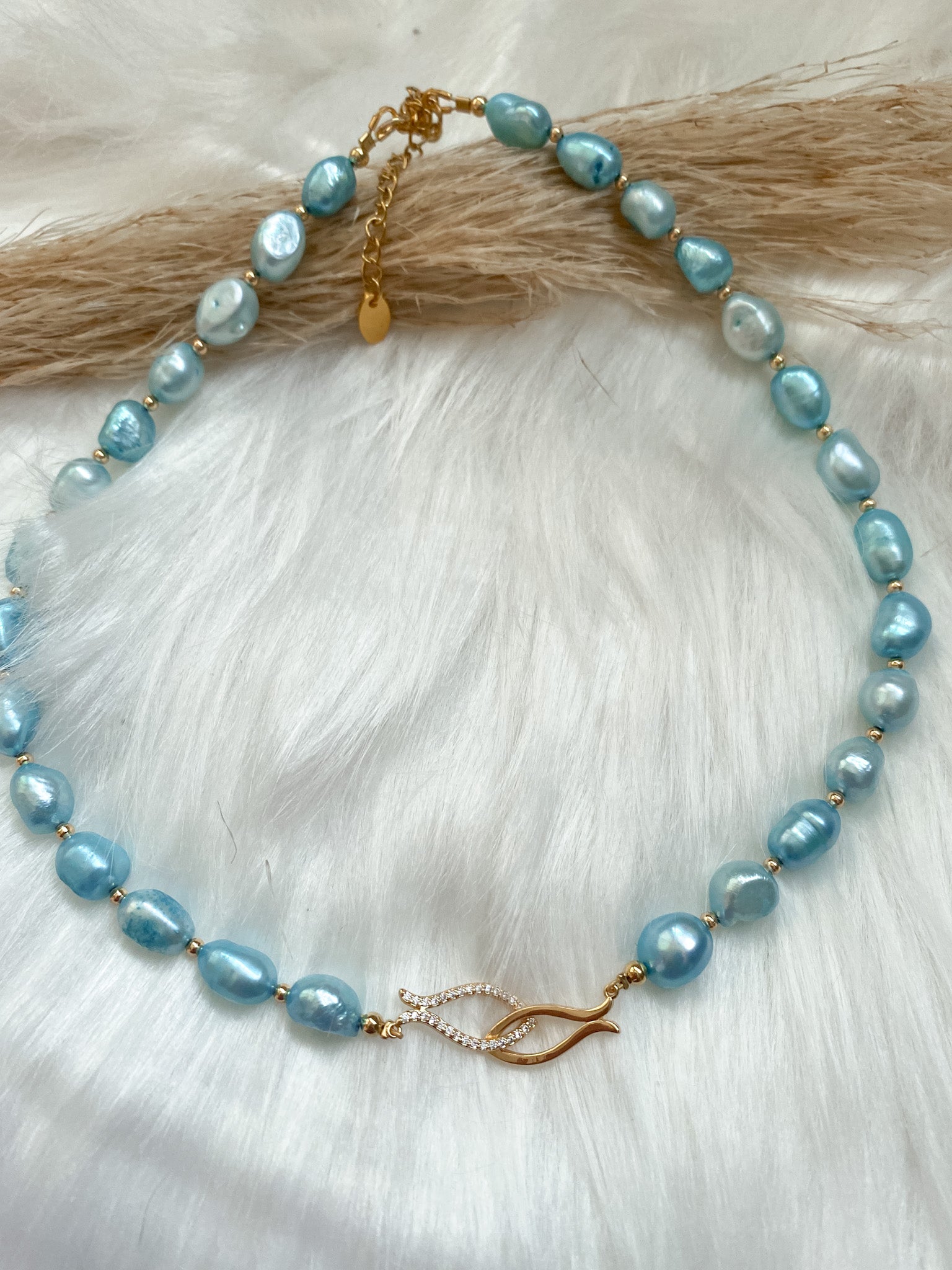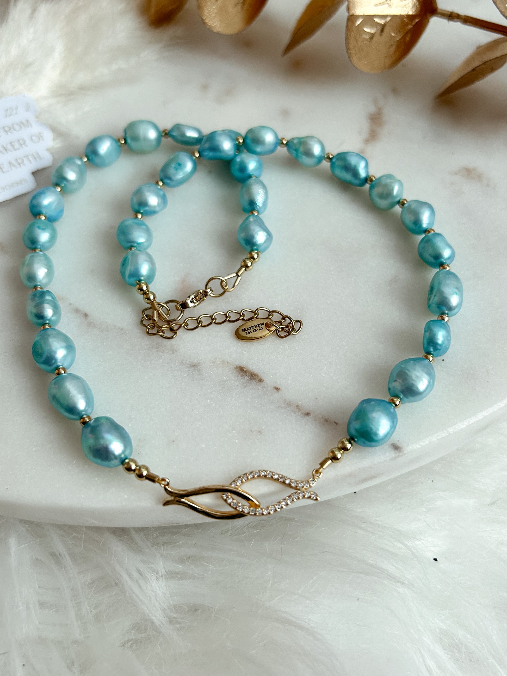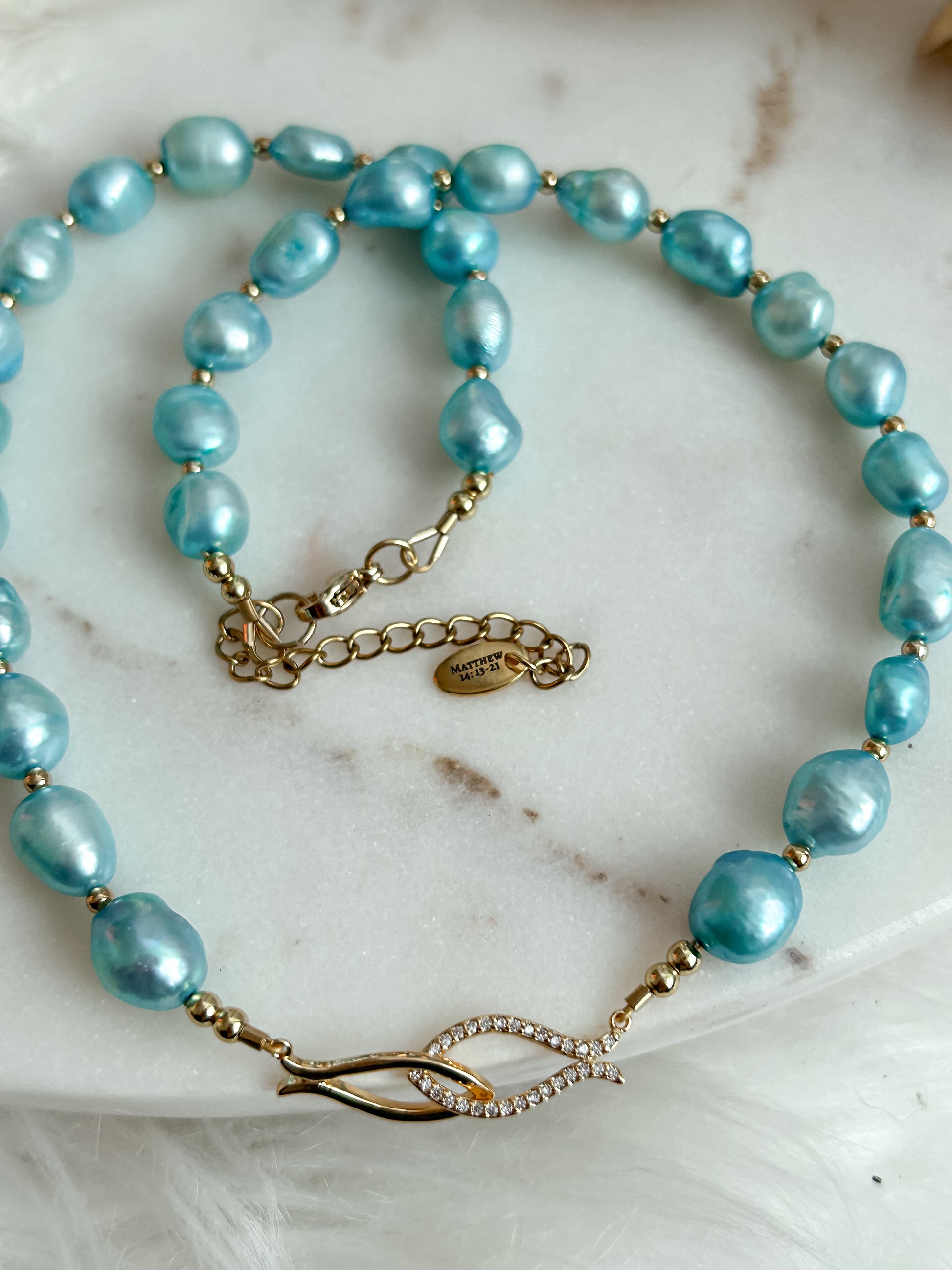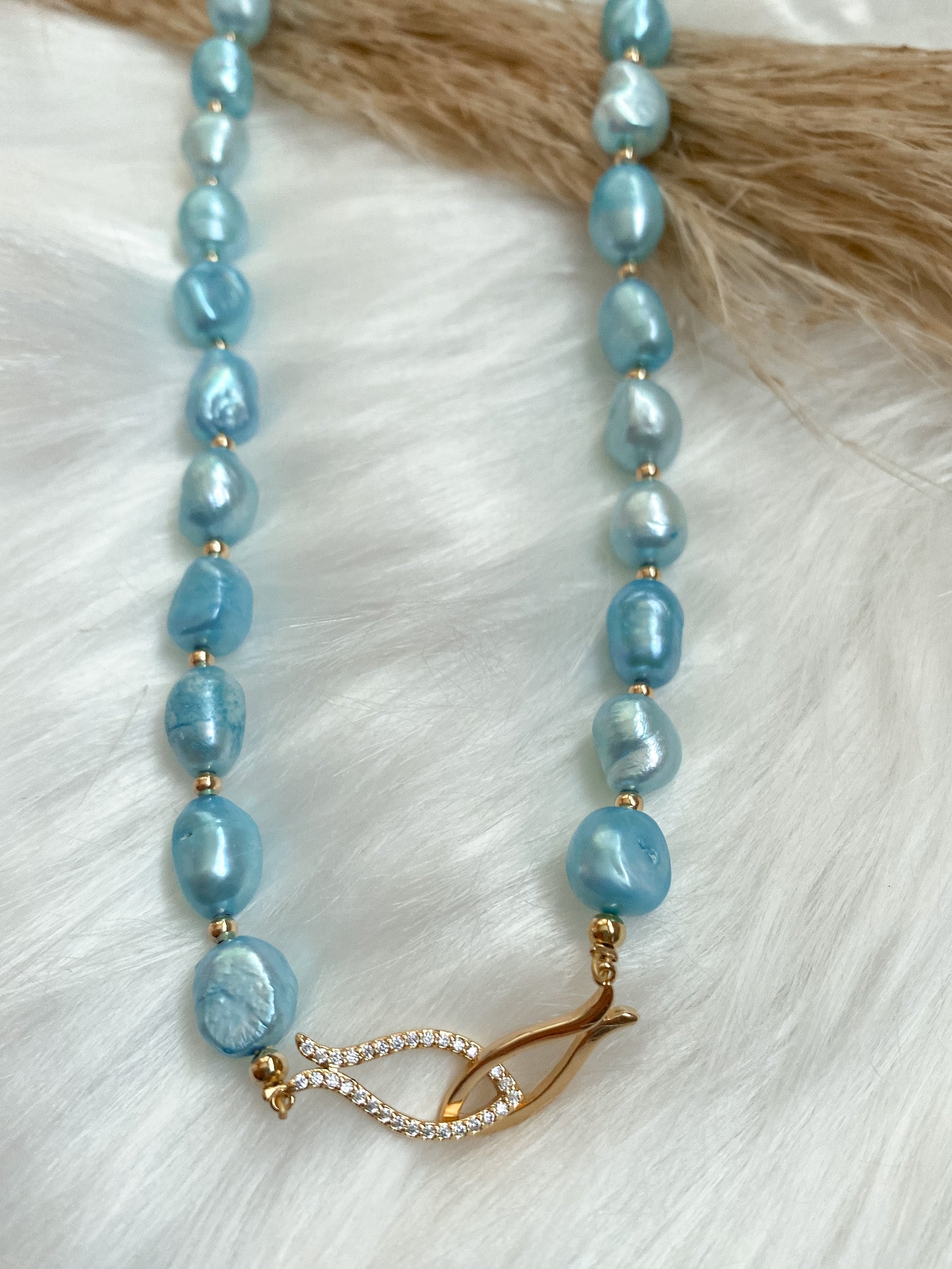Blue freshwater pearls and a cubic zirconia gold filled fish connector. 16” long.