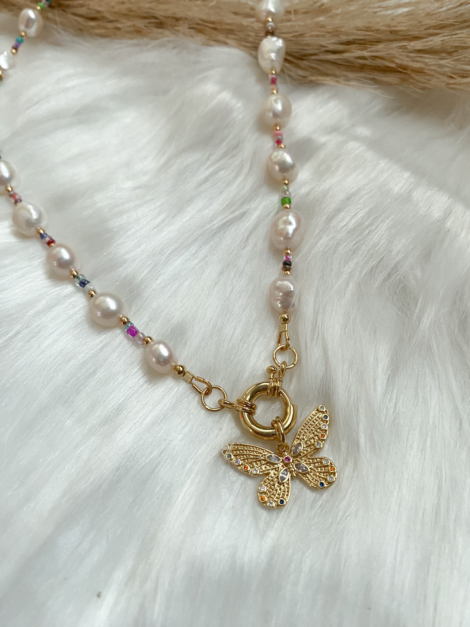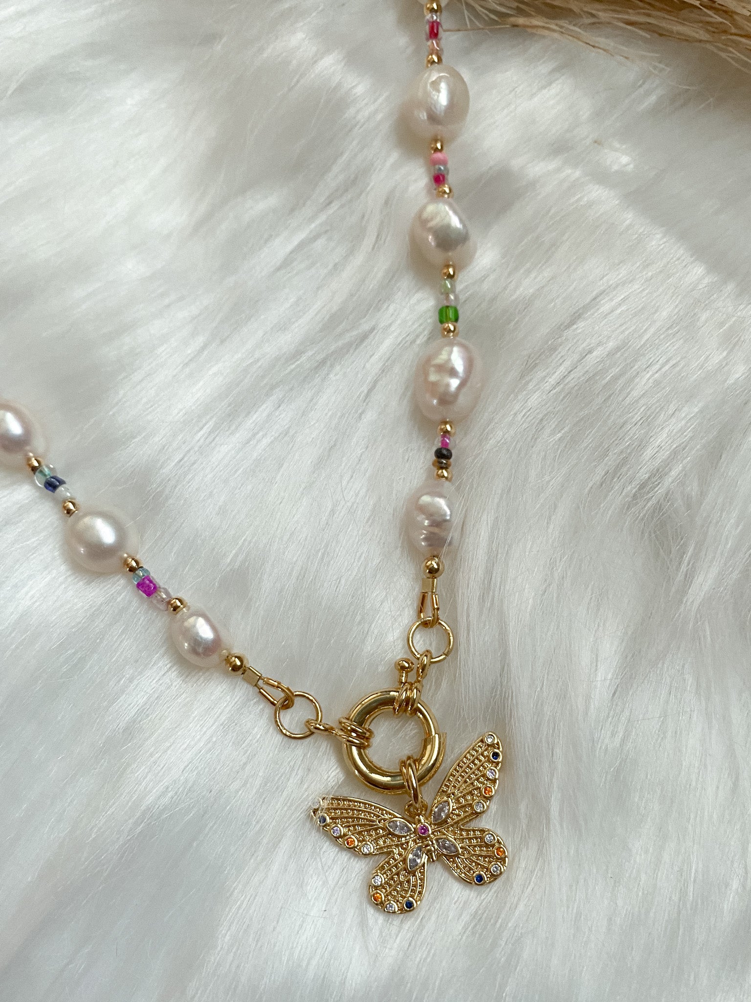 Freshwater pearls with a gold-filled butterfly.