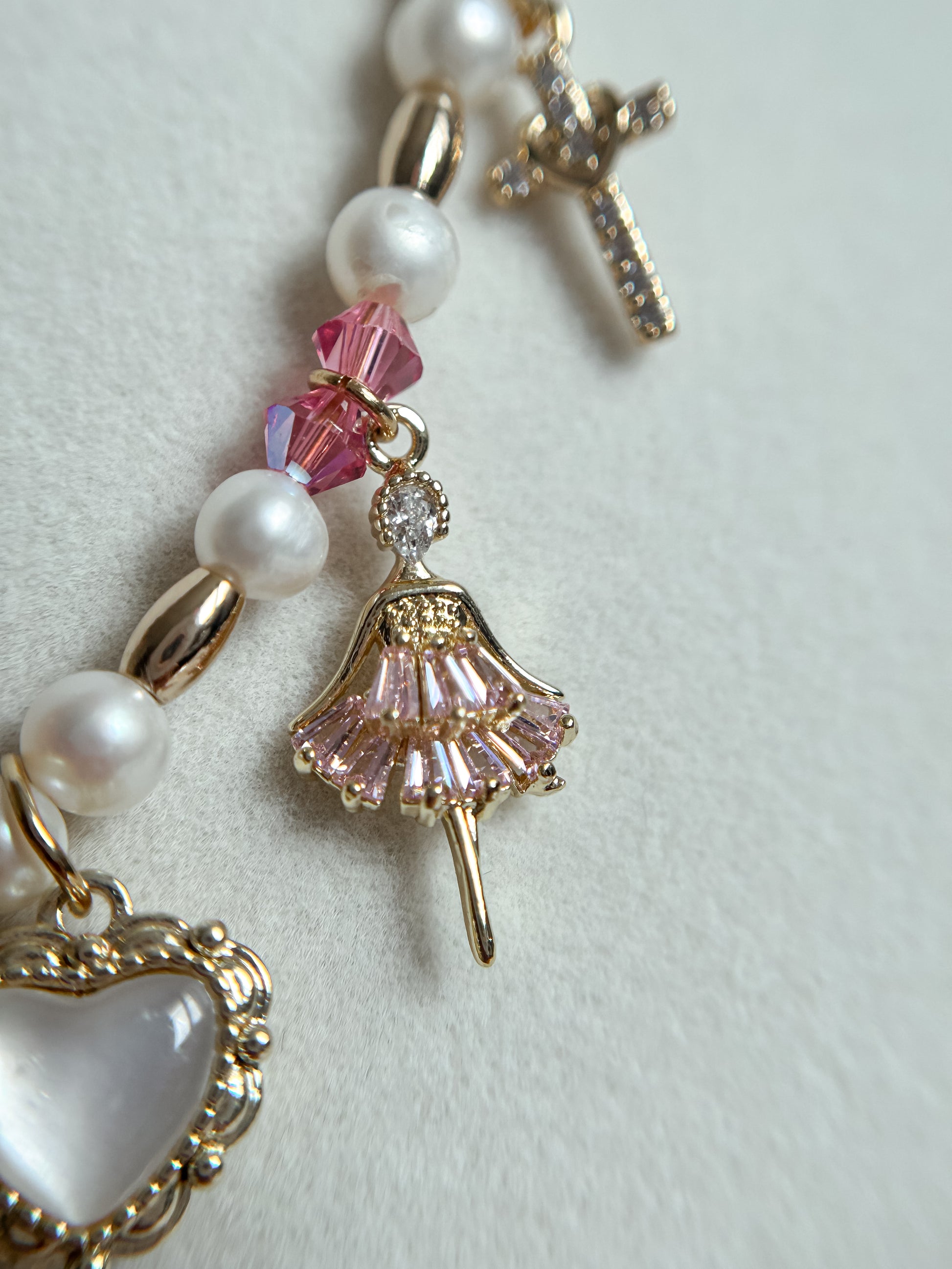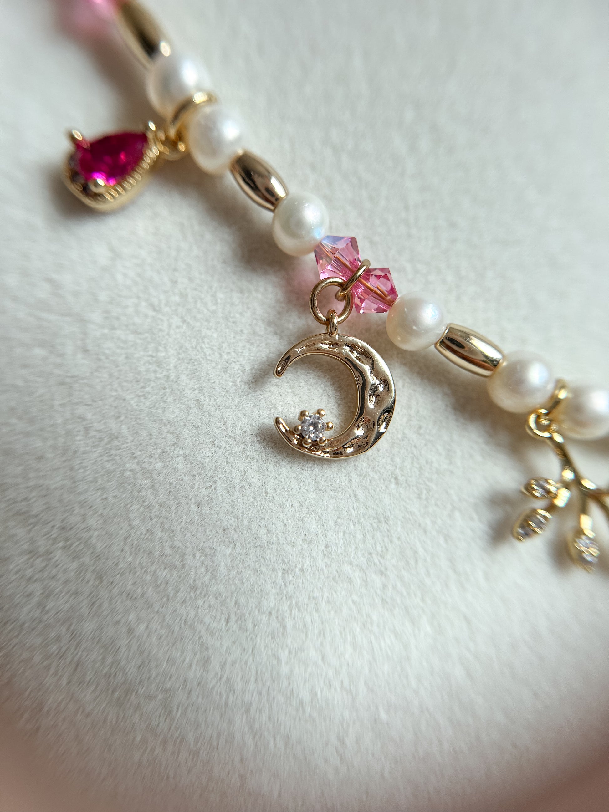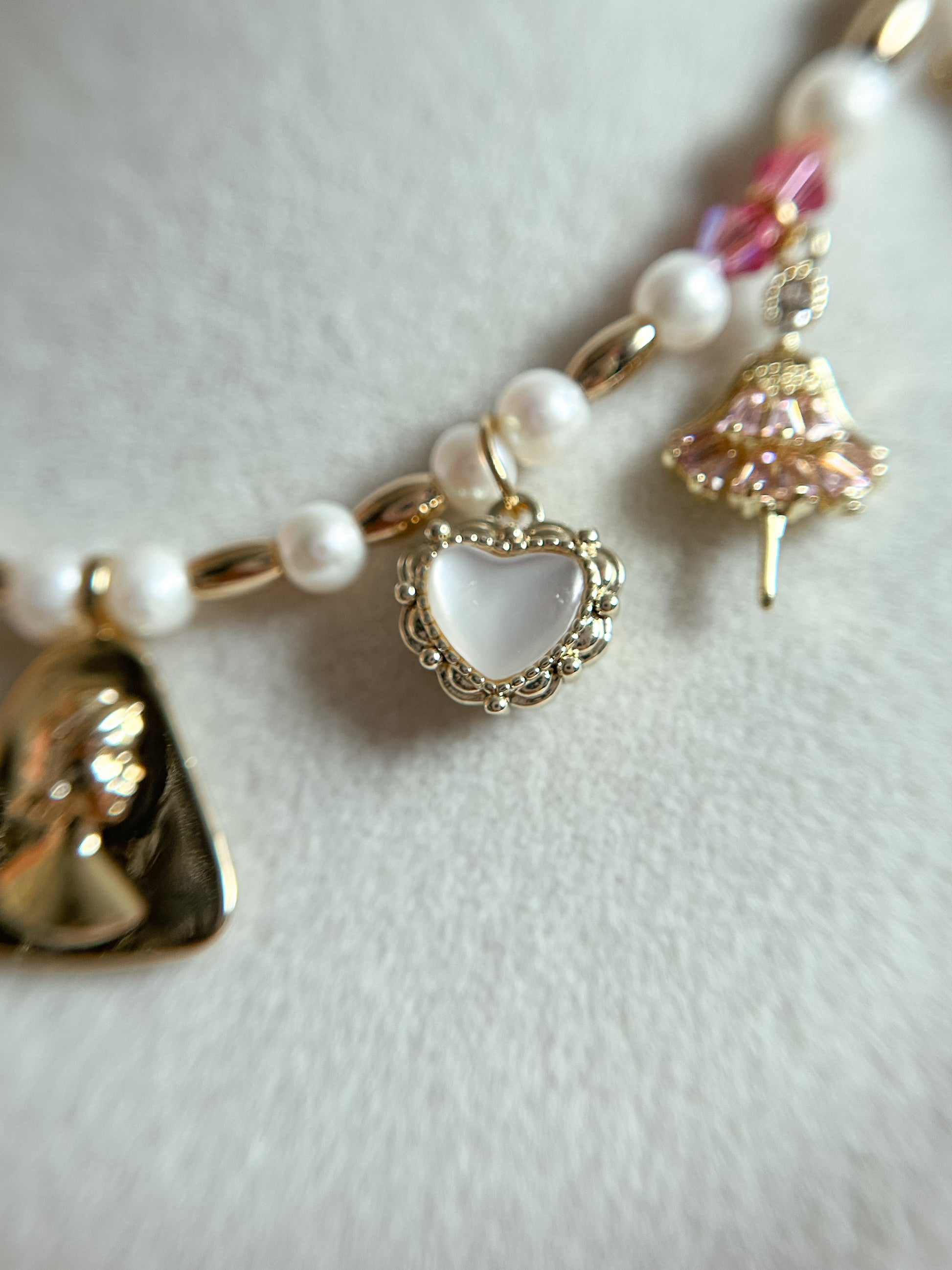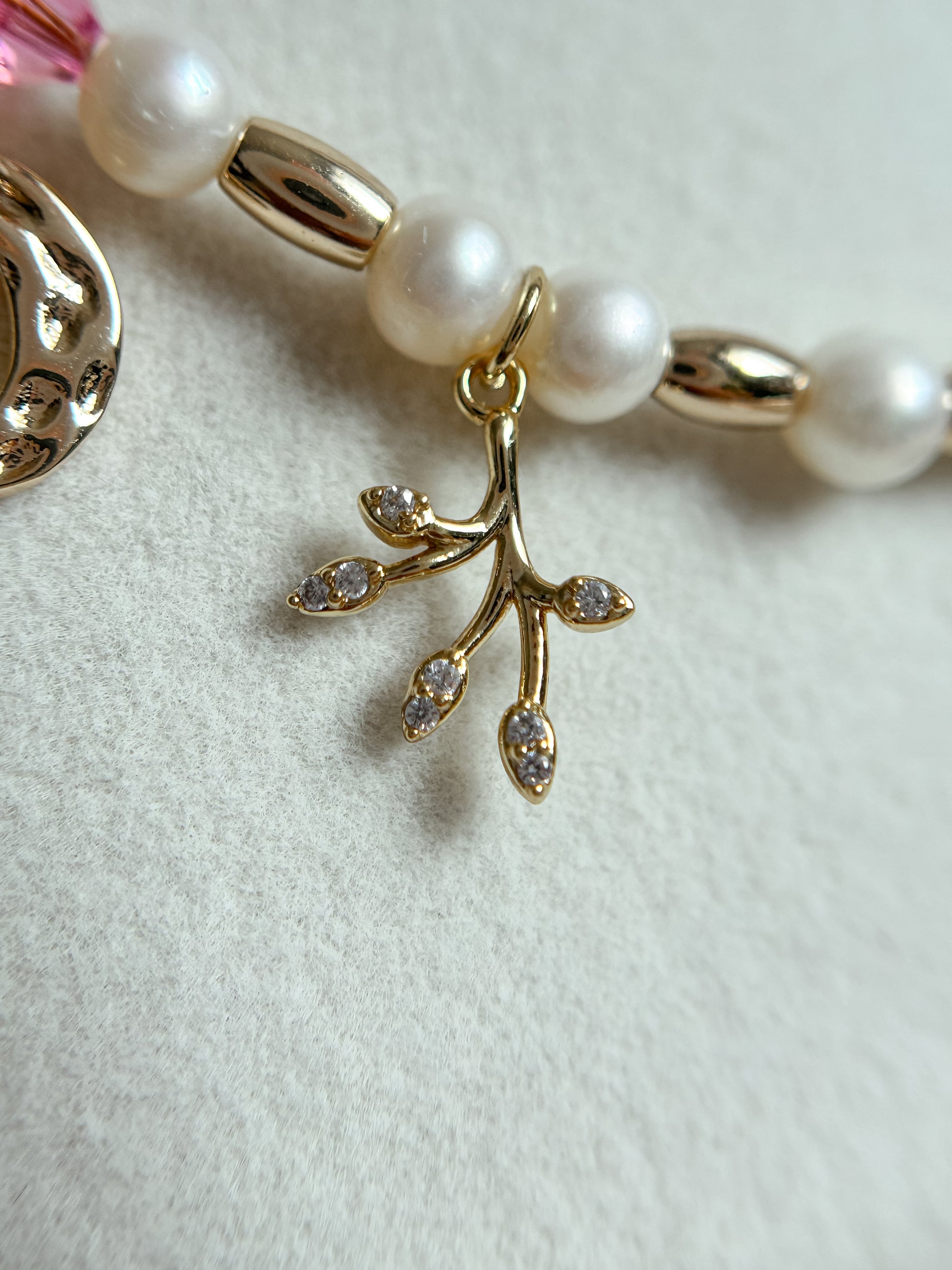 Made with freshwater pearls, real Swarovski, gold filled charms, some have cubic zirconia in them and a gold-filled necklace.