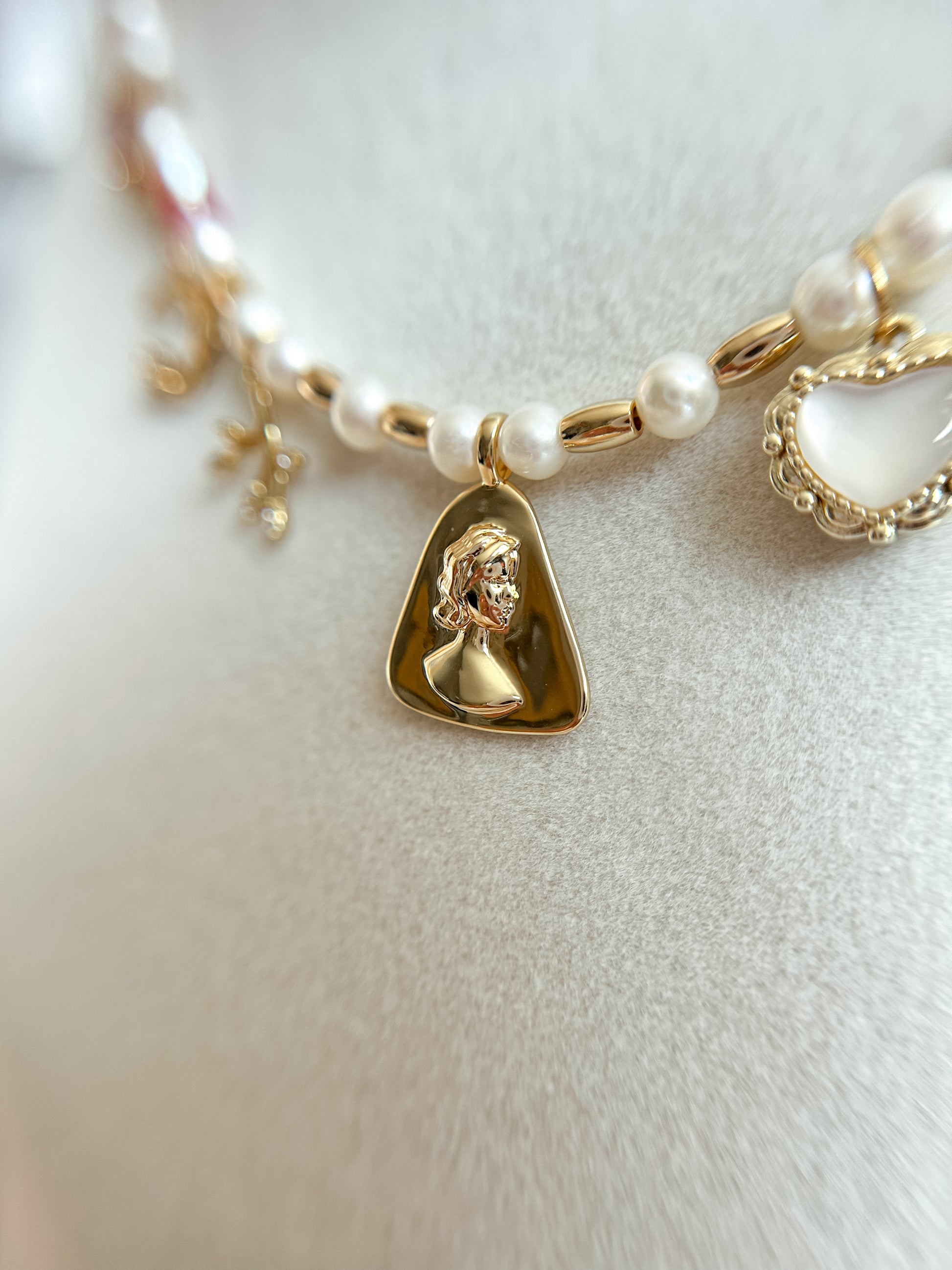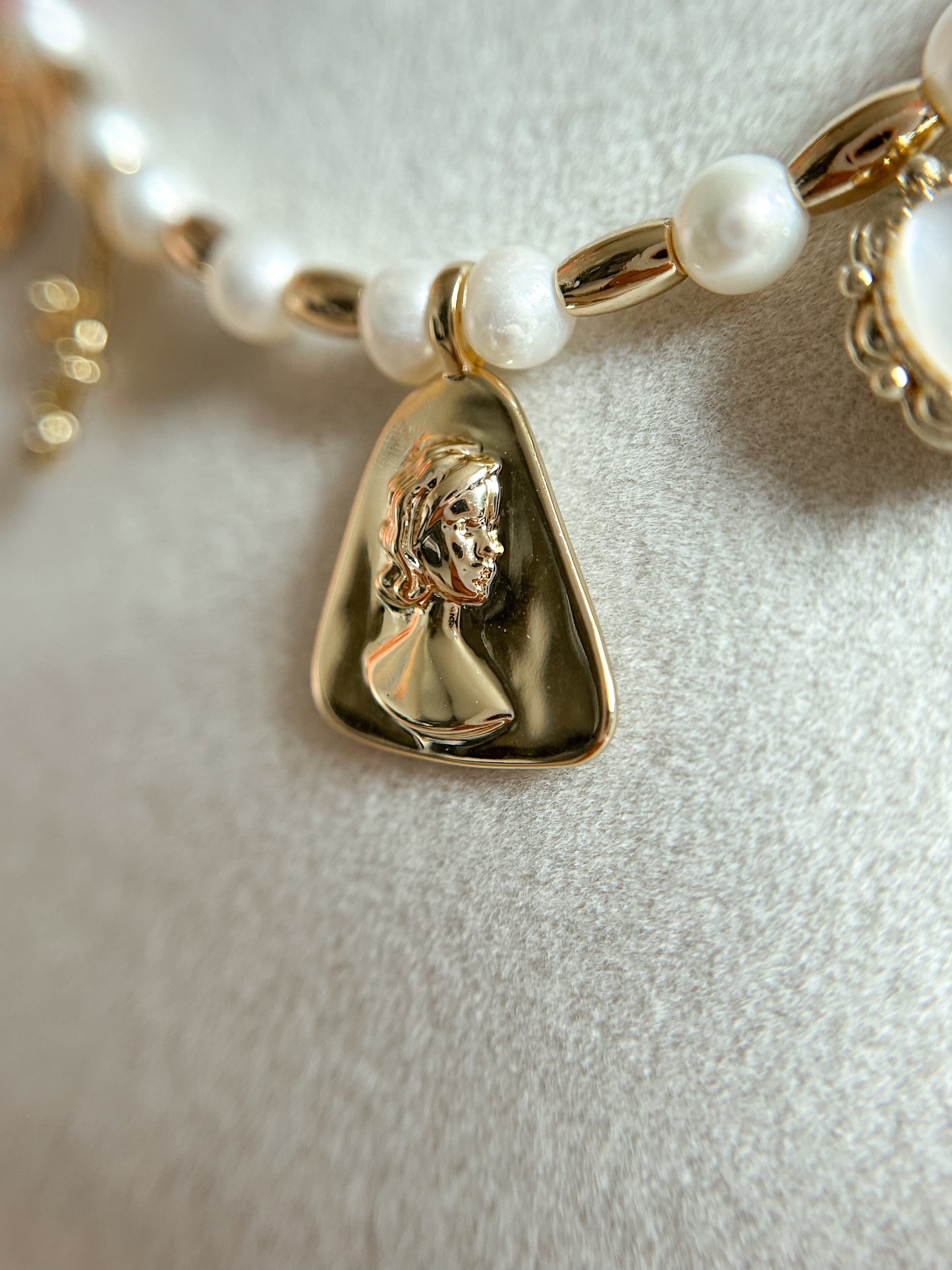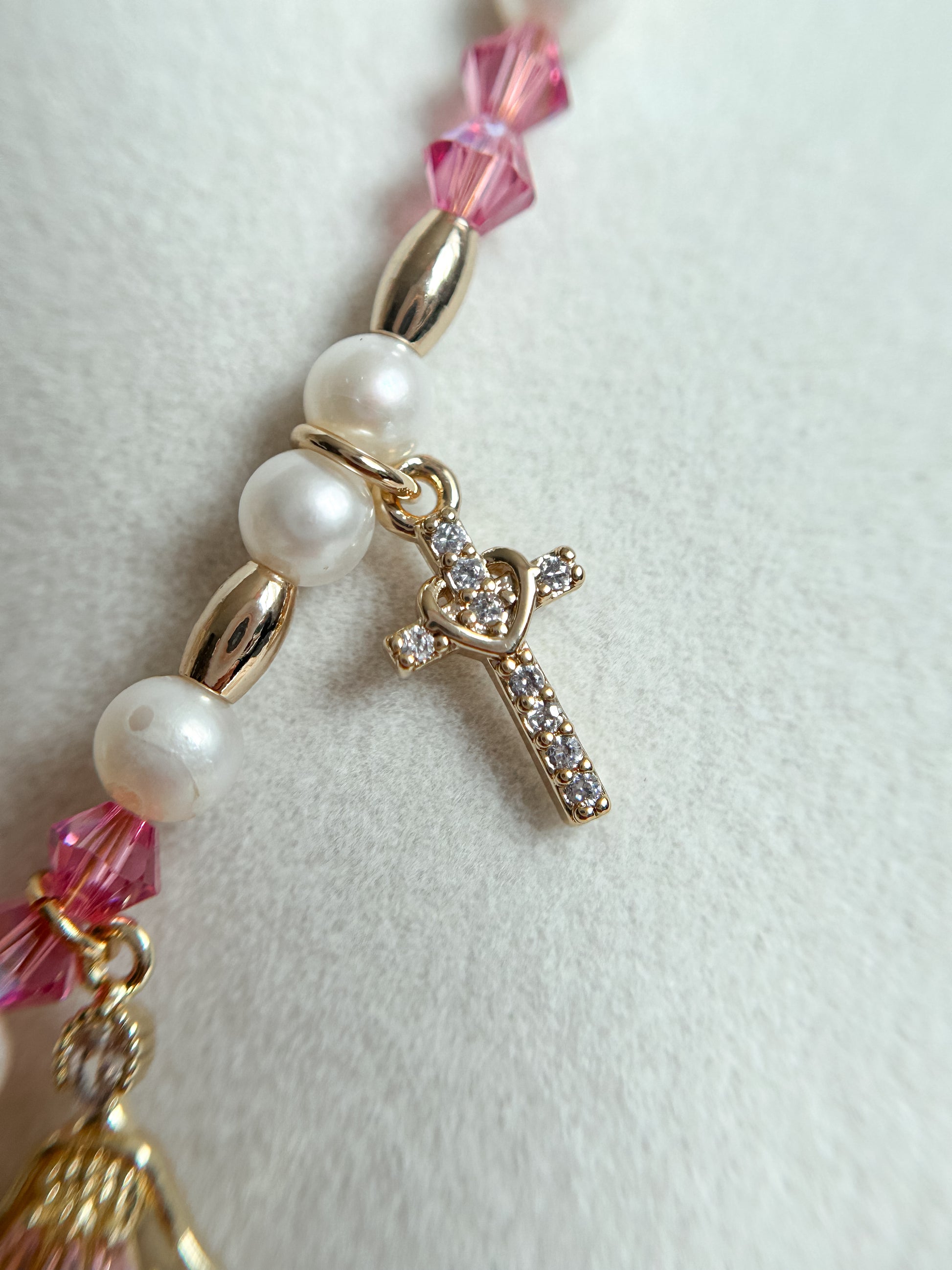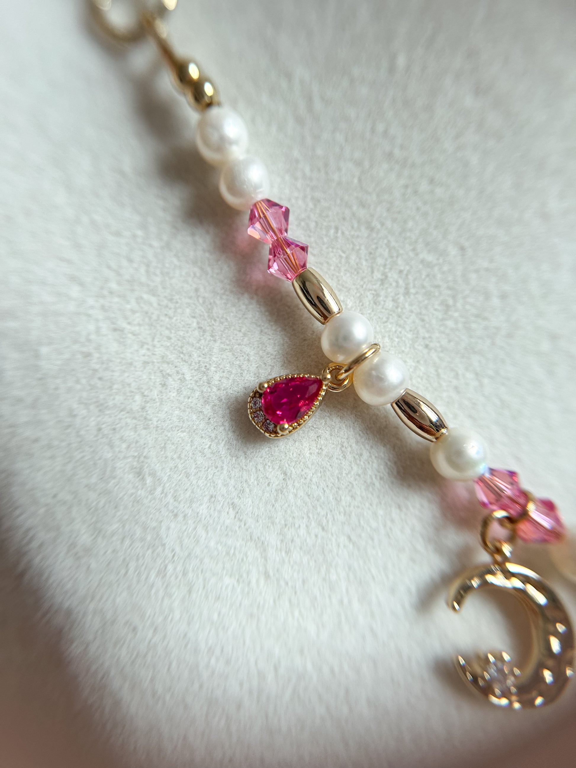 Made with freshwater pearls, real Swarovski, gold filled charms, some have cubic zirconia in them and a gold-filled necklace.