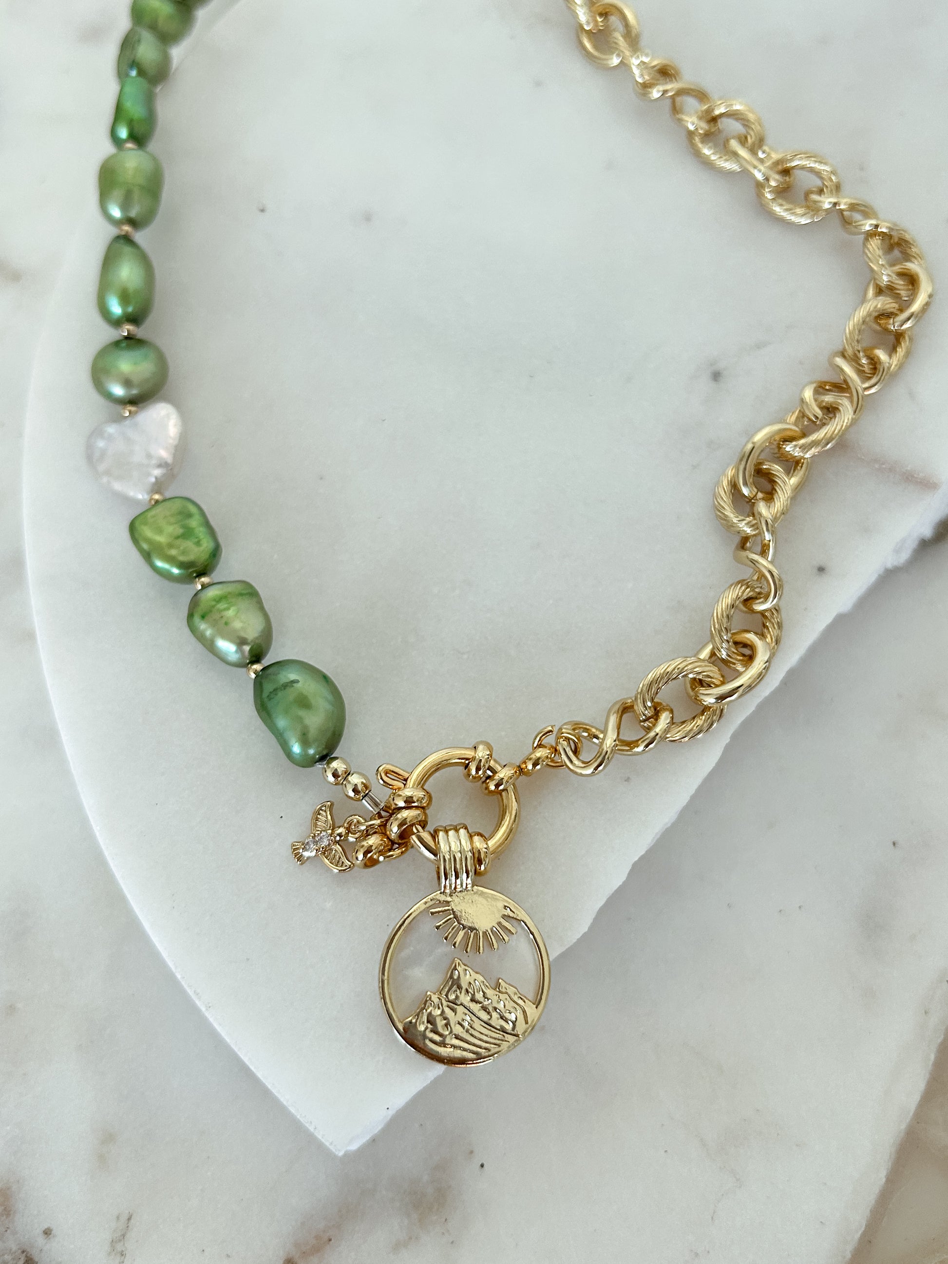 Made with freshwater pearls, gold filled knot chain, cubic zirconia tiny bird and a gold filled water/fire charm.