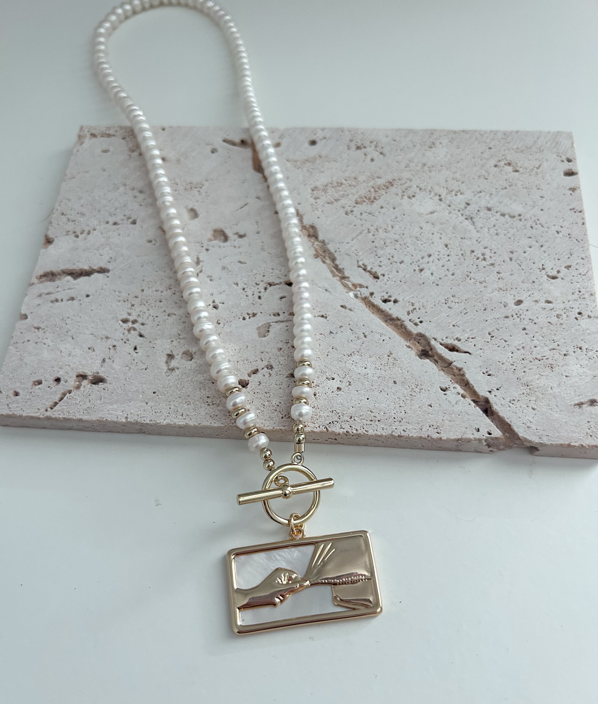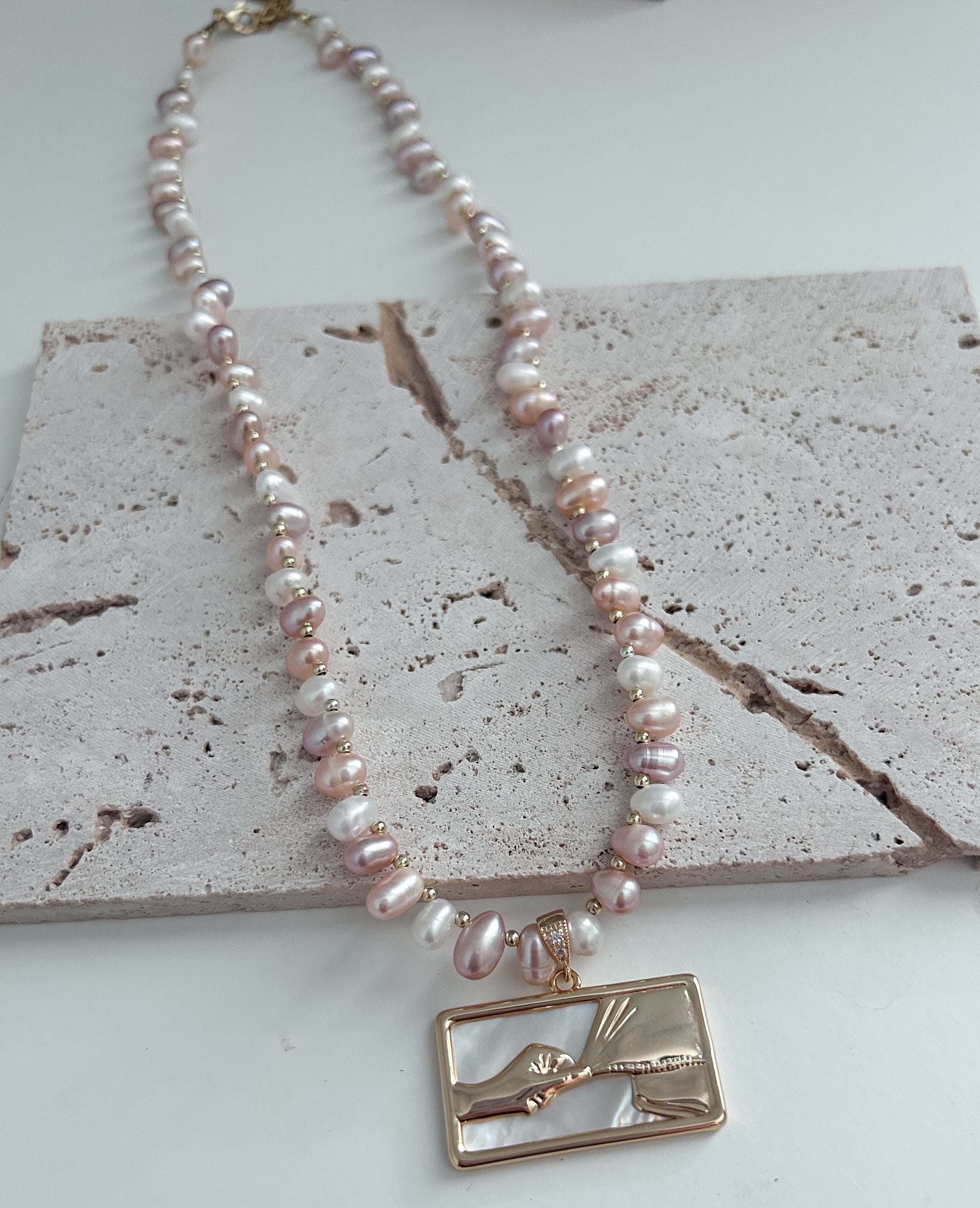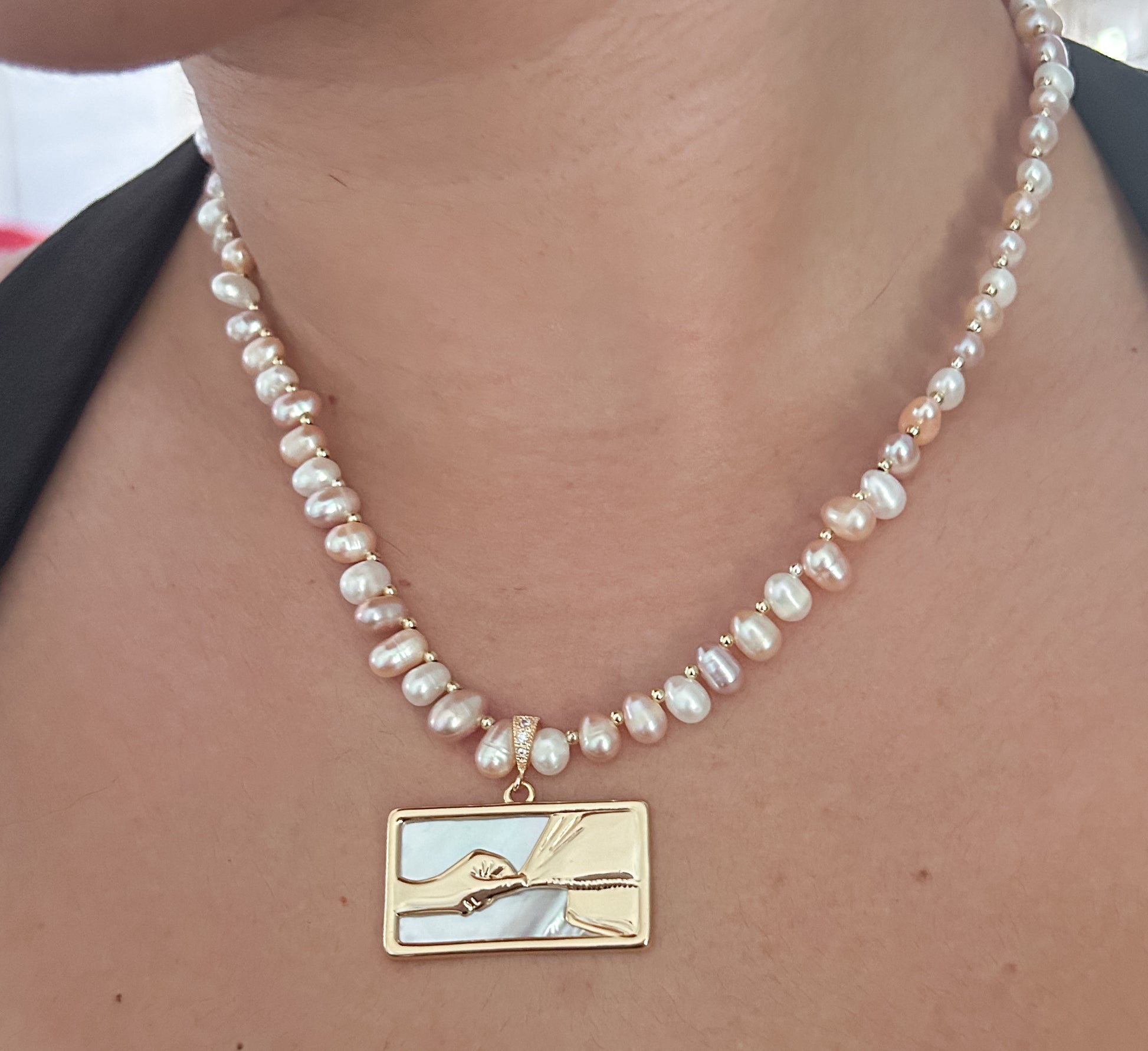 Delicate 17” freshwater pearls, gold-filled charm and clasp.